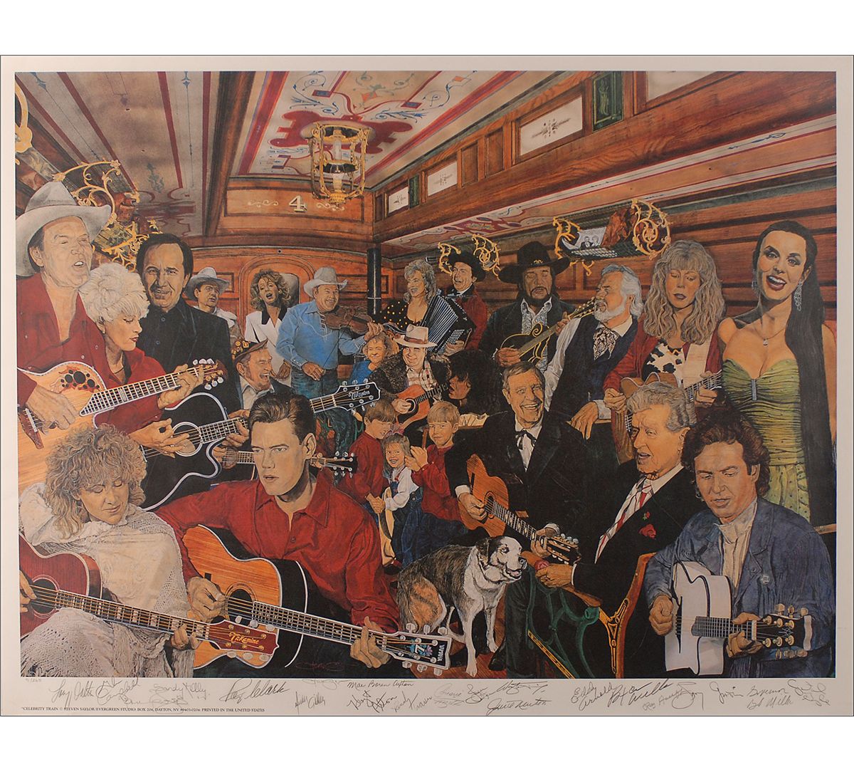 Color limited edition 32.5 x 25.25 print entitled Celebrity Train, numbered #91/260, signed in pencil by Roy Acuff, Eddy Arnold, Hoyt Axton, Mae Boren Axton, Glen Campbell, Roy Clark, Jessi Colter, Lacy J. Dalton, Larry Gatlin, Crystal Gayle, Mickey Gilley, Waylon Jennings, Sandy Kelly, Juice Newton, Kenny Rogers, Connie Smith, Randy Travis, Boxcar Willie, Nevada Governor Robert Miller and Danny the Dog. Scattered light creases, otherwise fine condition. Rolled.