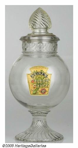 <B>Celery Sauce Display Jar 15 1/2" Tall With the Heinz Label on the Front</B></I> The lid has been sealed to the bottom of the jar and fits perfectly to the matching base design. No chips along the base but a few bubbles in the glass as might be expected from one made of this period. A tough display jar to find even without the label on the front. Lot:252