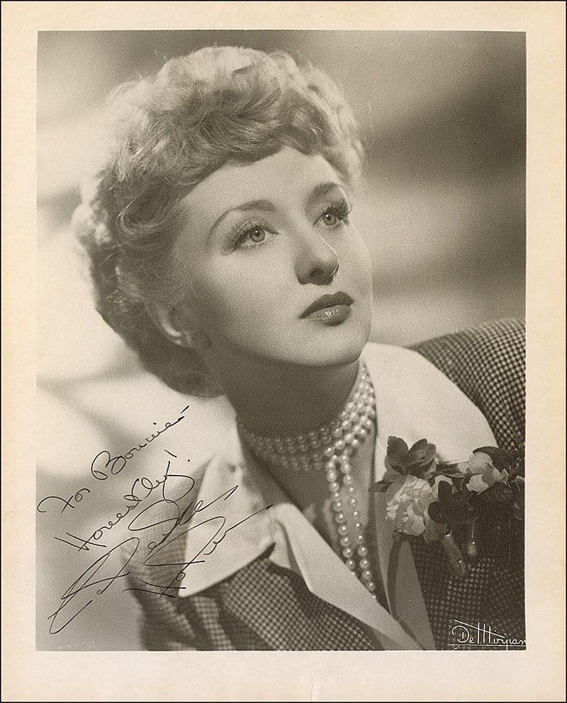 Vintage matte-finish 8 x 10 head-and-shoulders photo, signed and inscribed in fountain pen, “For Bonnie—Honestly! Celeste Holm.” A surface crease passing through the signature, light toning, and mild rippling to the top and bottom edges, otherwise fine condition.