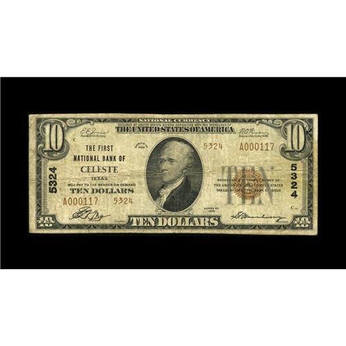 <B>Celeste, TX</B></I> - $10 1929 Ty. 2 <B>The First NB</B></I> Ch. # 5324<BR>We sold a nearly identical $10 Ty. 2 from here in the same <B>Fine-Very Fine</B></I> grade in our September, 2004 Long Beach Signature Sale. It went for $833.75, a figure likely to be the starting point for the competition within the Texas collecting community tonight. This addition to the census is only the fifth 1929 series note from here to have its survival verified. Expect a realization after spirited bidding of at least...<BR><BR><b>Shipping:</b> Coin/Currency (<a target="_blank" href="http://www.heritageauctions.com/common/shipping.php">view shipping information</a>)