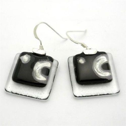 Celestial Black Stacked Glass Squares Sterling Silver E **|**|** Earrings feature an asymmetrical silver pattern in an opaque square of fused glass mounted on a clear piece of glass with sterling silver bracket and hooks. Earrings measure 0.75 inches square.Fused glass is made by the Calypso artisans #CJGEDOT_229537