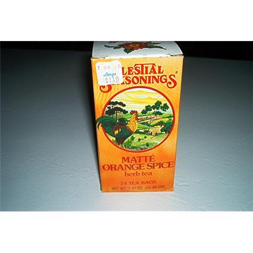 Vintage cardboard box of Celestial Seasonings which has never been opened. Beautiful and bright colors. The flavor state: MATTE ORANGE SPICE-HERB TEA BAGS. Net. Wt. 1.97 oz. A lovely red, yellow, and brown Rooster adorns the box standing on a hill getting ready to wake everyone in the green valley below. Original price tag is still attached. Dated: 1976. Great addition to a shelf in your kitchen.
