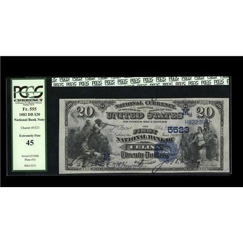 <B>Celina, OH</B></I> - $20 1882 Date Back Fr. 555 <B>The First NB</B></I> Ch. # (M)5523<BR>A nicely margined early note from this none too common bank. PCGS has graded this as <B>Extremely Fine 45.</B></I>