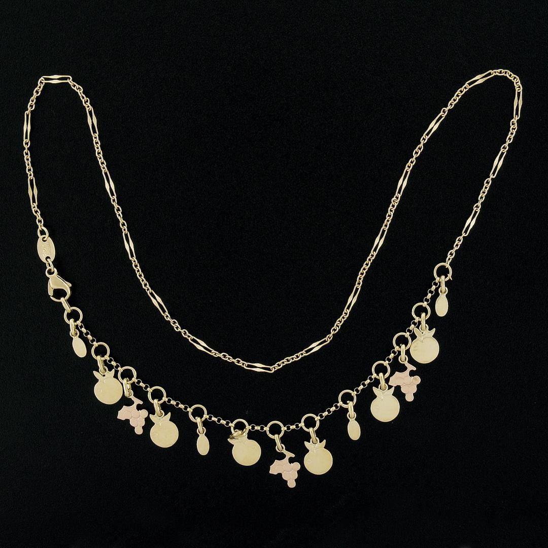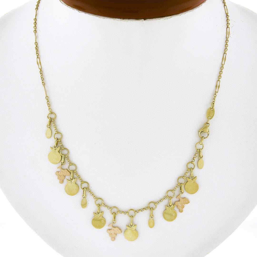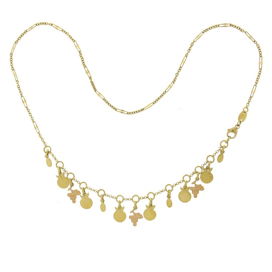 A solid 18k yellow & rose gold dangle charms necklace by Celine. It weighs a total of 8.70 grams, measures 14.3mm wide at the grape charm, and measures 16.5 inches in length.