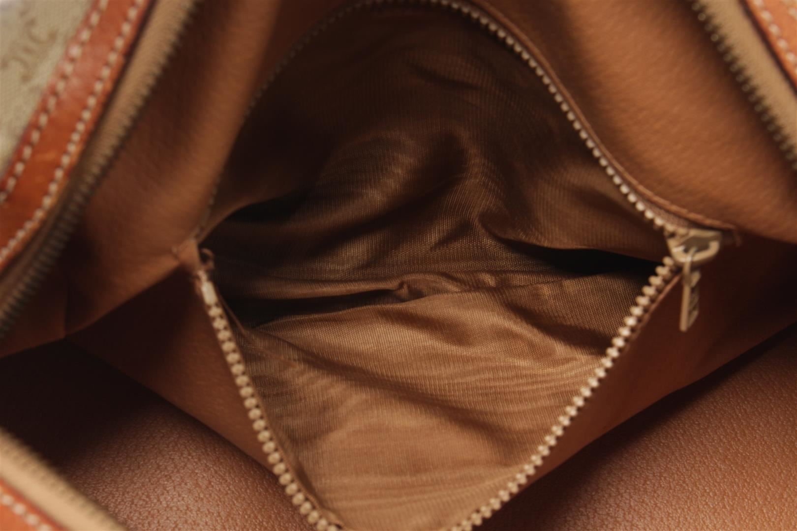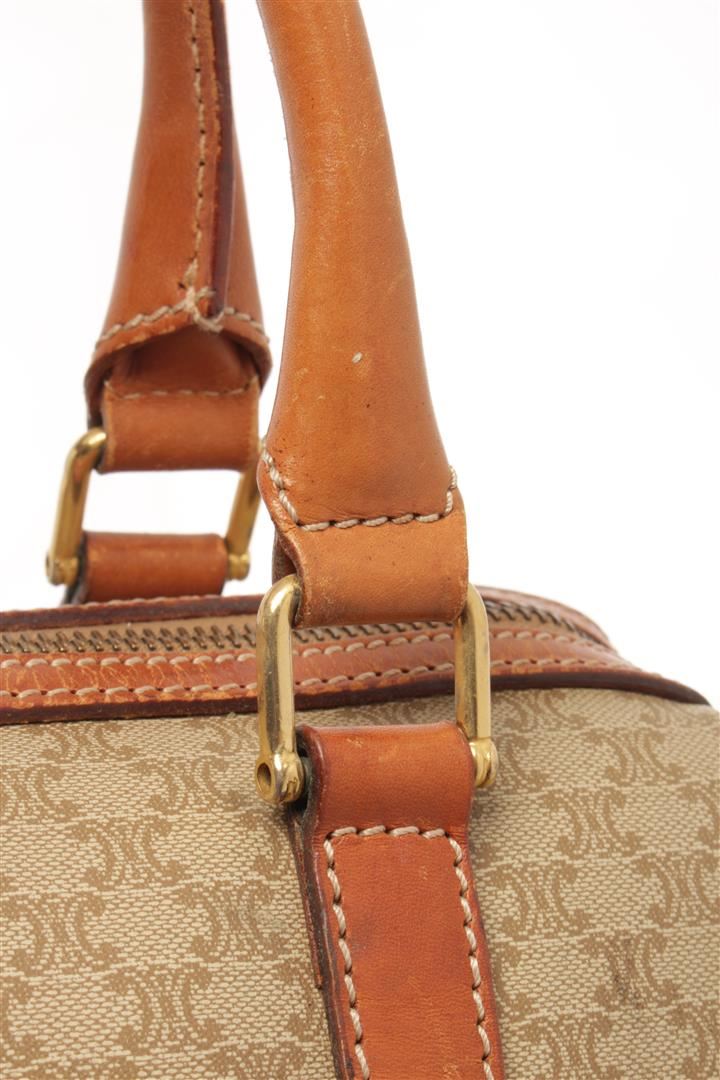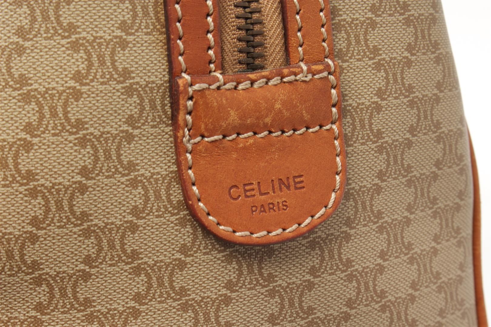 Celine Beige Canvas Leather Mini Boston Bag. All available information is listed in the description and shown in the photos. celine beige canvas leather mini boston bag with macadam pattern, logo patch to the front, two rounded top handles, top zip fastening, main compartment, internal zip-fastening pocket, slip pocket to the front, gold-tone hardware. Depth 6.7 in, Height 7.9 in, Width 12.6 in/ Depth 17 cm, Height 20 cm, Width 32 cm