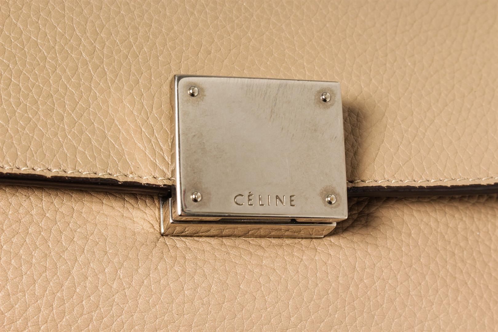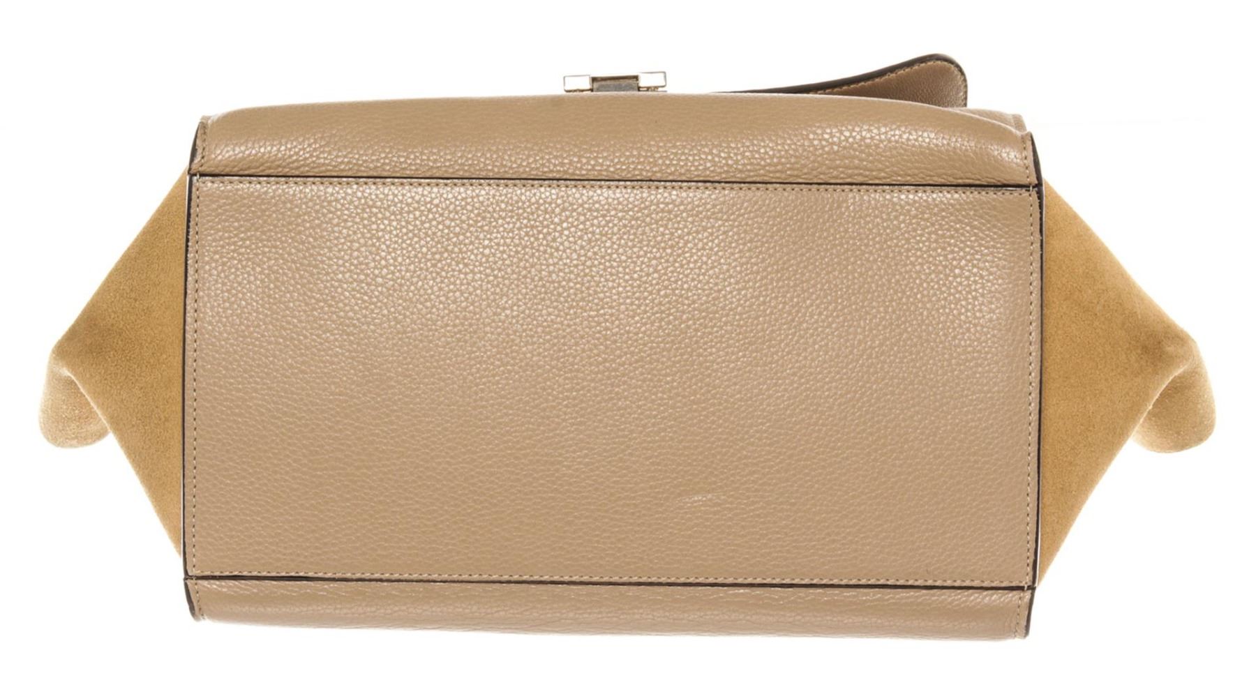 One Celine Beige Leather Suede Trapeze Two-Way Bag. Item is sold AS-IS. All available information is listed in the description and shown in the photo. Beige leather and suede Celine Trapeze 2way bag with silver-tone hardware, single rolled top handle, dual side gussets with snap expansions, exterior zip pocket at back, tonal leather lining, dual interior slit pockets and flip-lock closure at front flap. Detachable shoulder strap. Base L:10.5" Top L:18" W:6" H:8" HD:4"