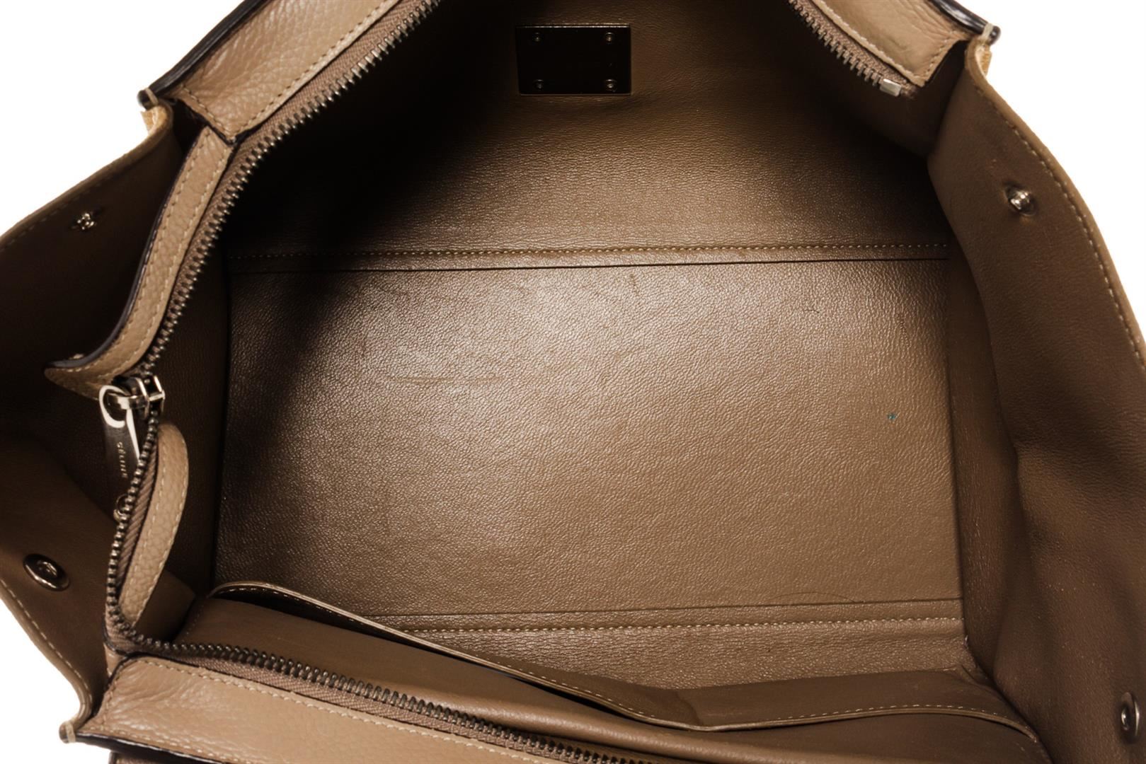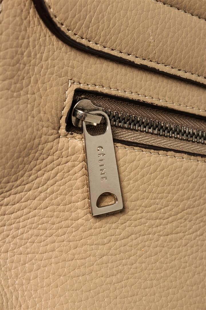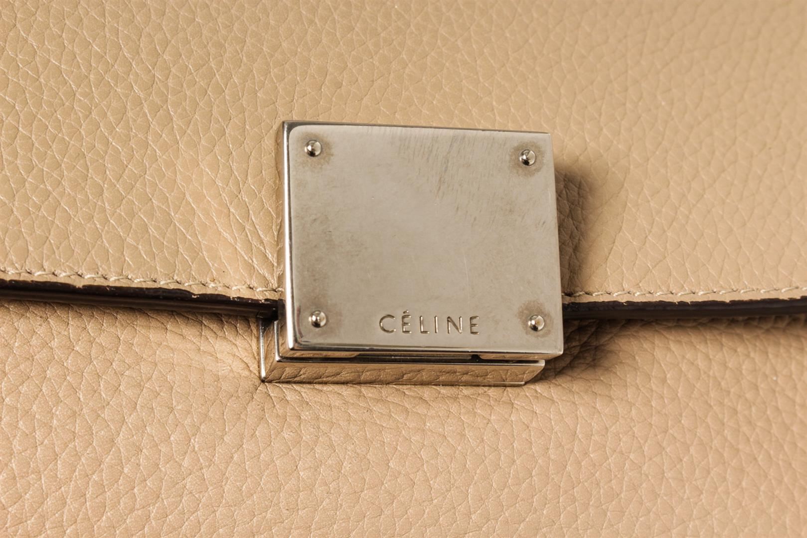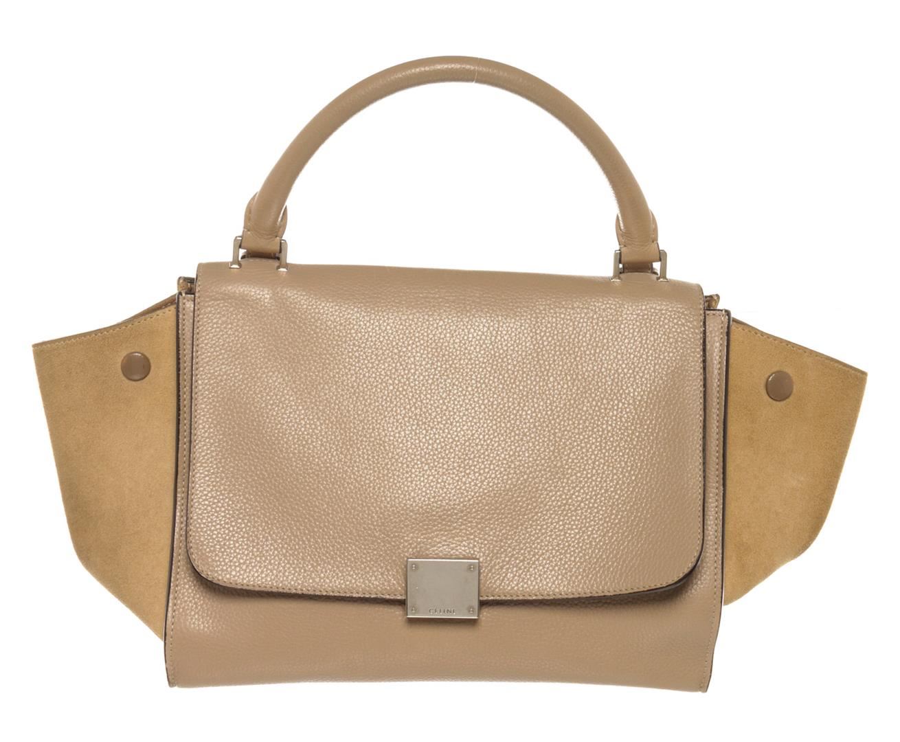 One Celine Beige Leather Suede Trapeze Two-Way Bag. Item is sold AS-IS. All available information is listed in the description and shown in the photo. Beige leather and suede Celine Trapeze 2way bag with silver-tone hardware, single rolled top handle, dual side gussets with snap expansions, exterior zip pocket at back, tonal leather lining, dual interior slit pockets and flip-lock closure at front flap. Detachable shoulder strap. Base L:10.5" Top L:18" W:6" H:8" HD:4"