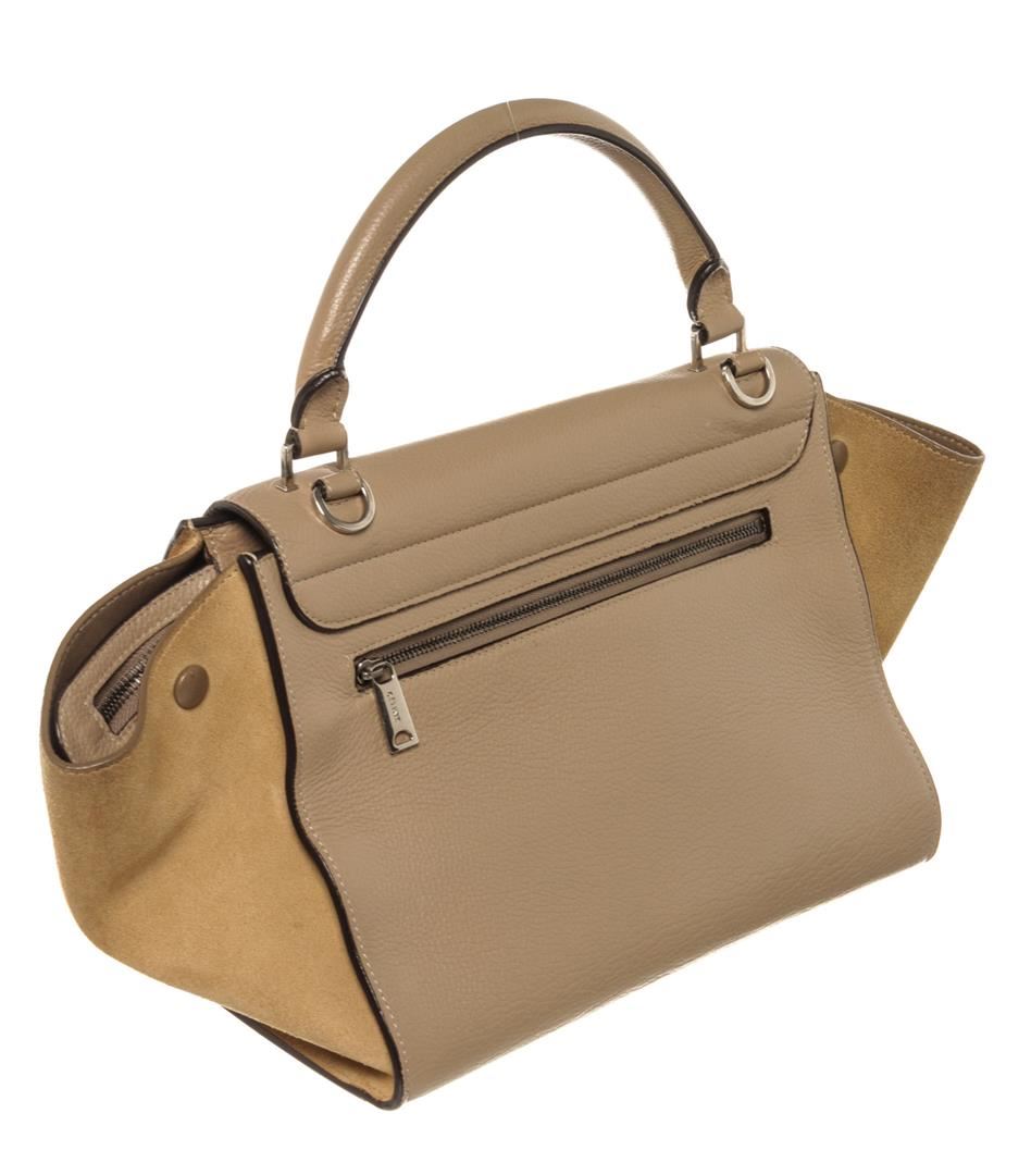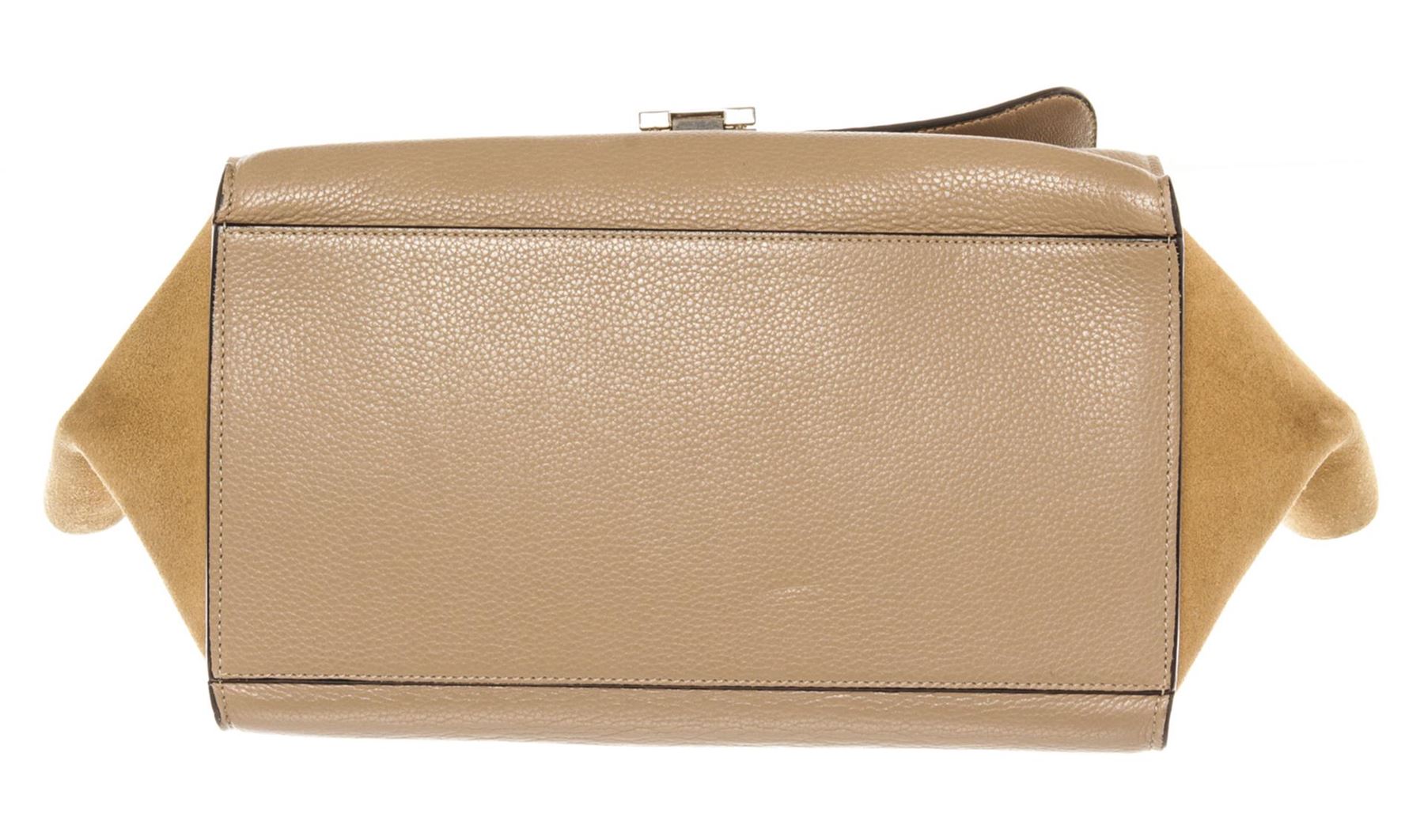 One Celine Beige Leather Suede Trapeze Two-Way Bag. Item is sold AS-IS. All available information is listed in the description and shown in the photo. Beige leather and suede Celine Trapeze 2way bag with silver-tone hardware, single rolled top handle, dual side gussets with snap expansions, exterior zip pocket at back, tonal leather lining, dual interior slit pockets and flip-lock closure at front flap. Detachable shoulder strap. Base L:10.5" Top L:18" W:6" H:8" HD:4"
