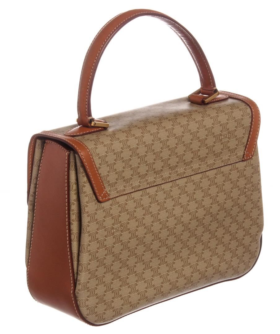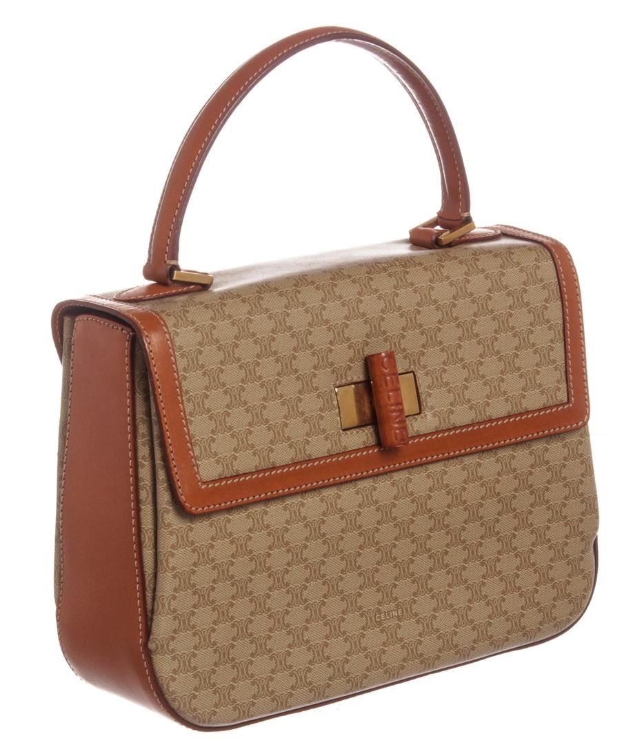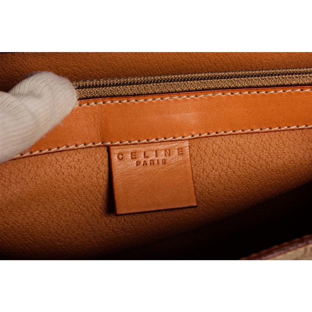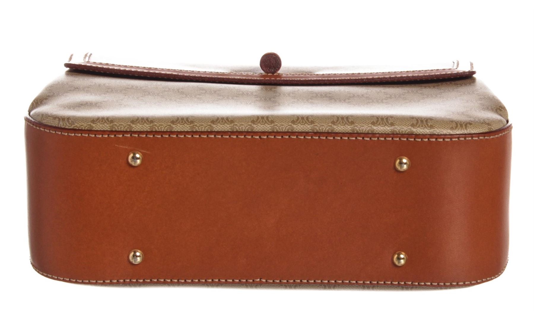 Celine beige Macadam coated canvas monogram Vintage Top Handle bag with tan leather trim, gold-tone hardware, brown leather lining, three interior compartments, center with zip top, flap closure with turn-lock.