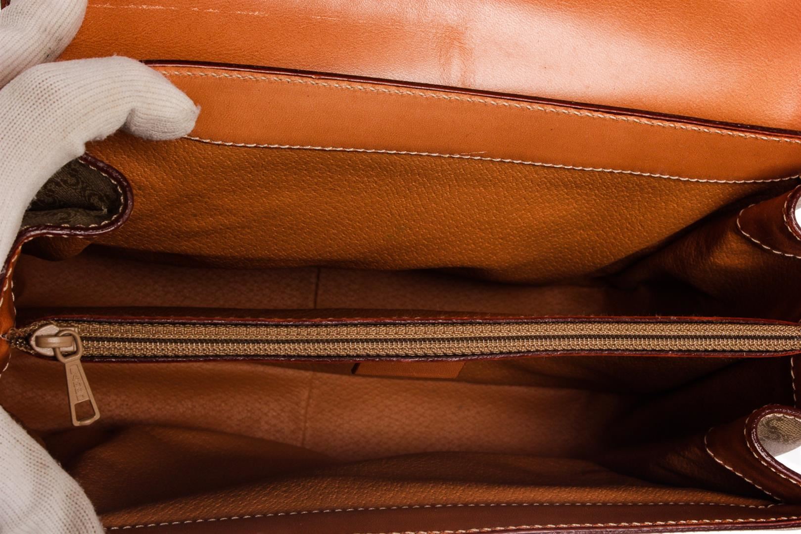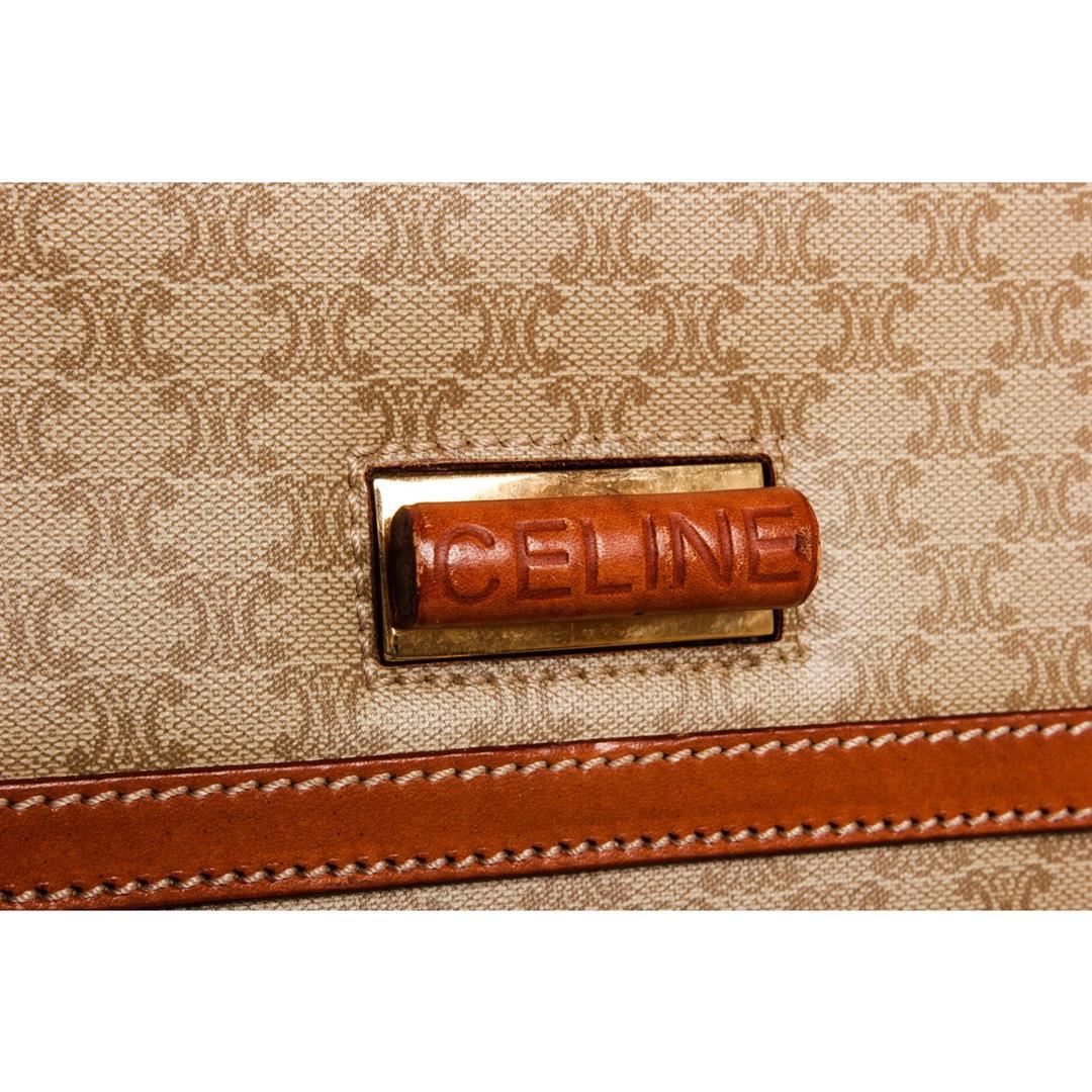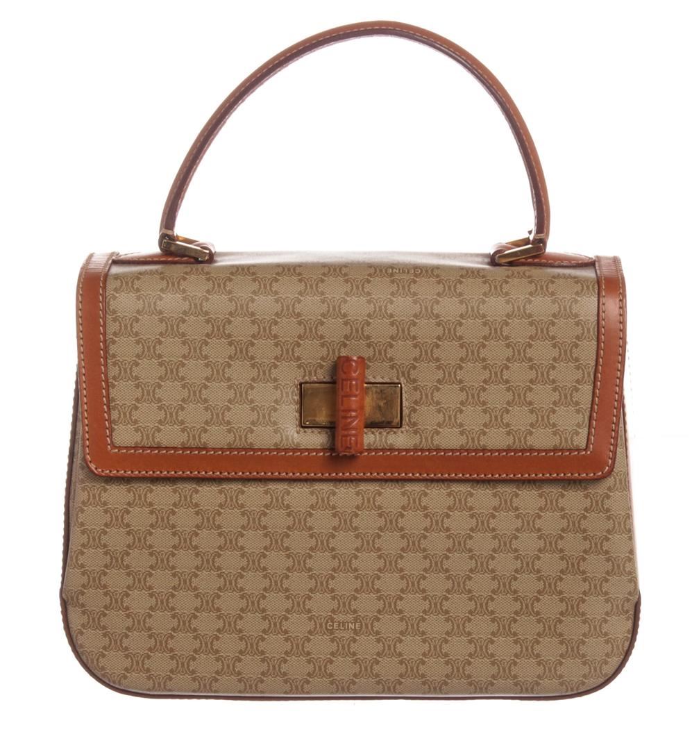 Celine beige Macadam coated canvas monogram Vintage Top Handle bag with tan leather trim, gold-tone hardware, brown leather lining, three interior compartments, center with zip top, flap closure with turn-lock.