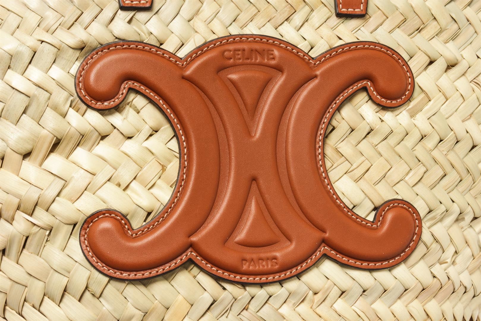 One Celine Beige Wicker Classic Basket Teen Triomphe Tote Bag. Item is sold AS-IS. All available information is listed in the description and shown in the photo. Celine Beige Wicker Classic Basket Teen Triomphe Tote Bag with top handle, brown leather logo on front of bag, longer shoulder strap. 19 x 20 x 10 cm (7 x 8 x 4 in)