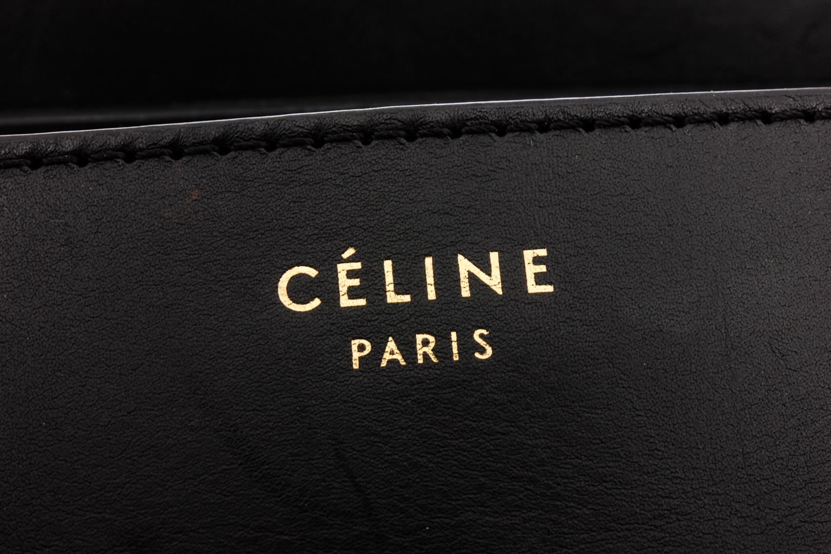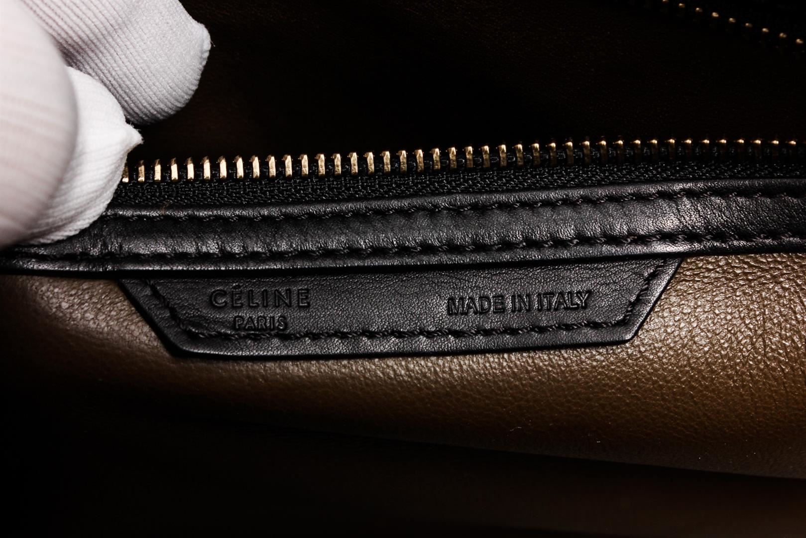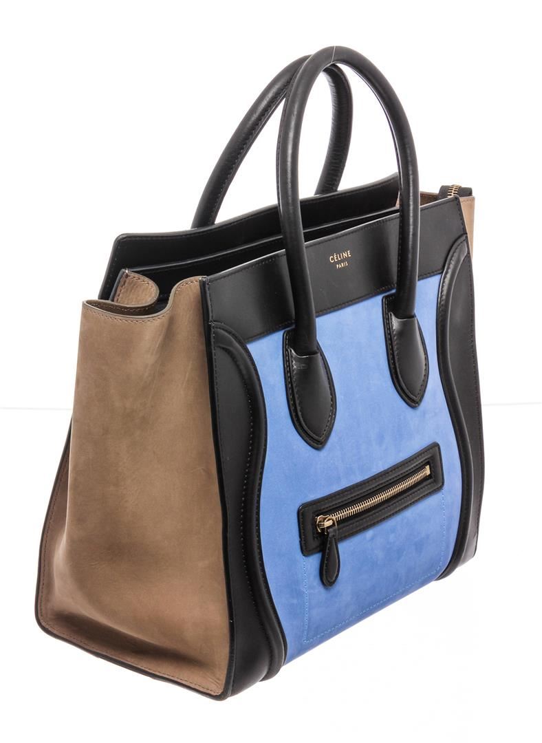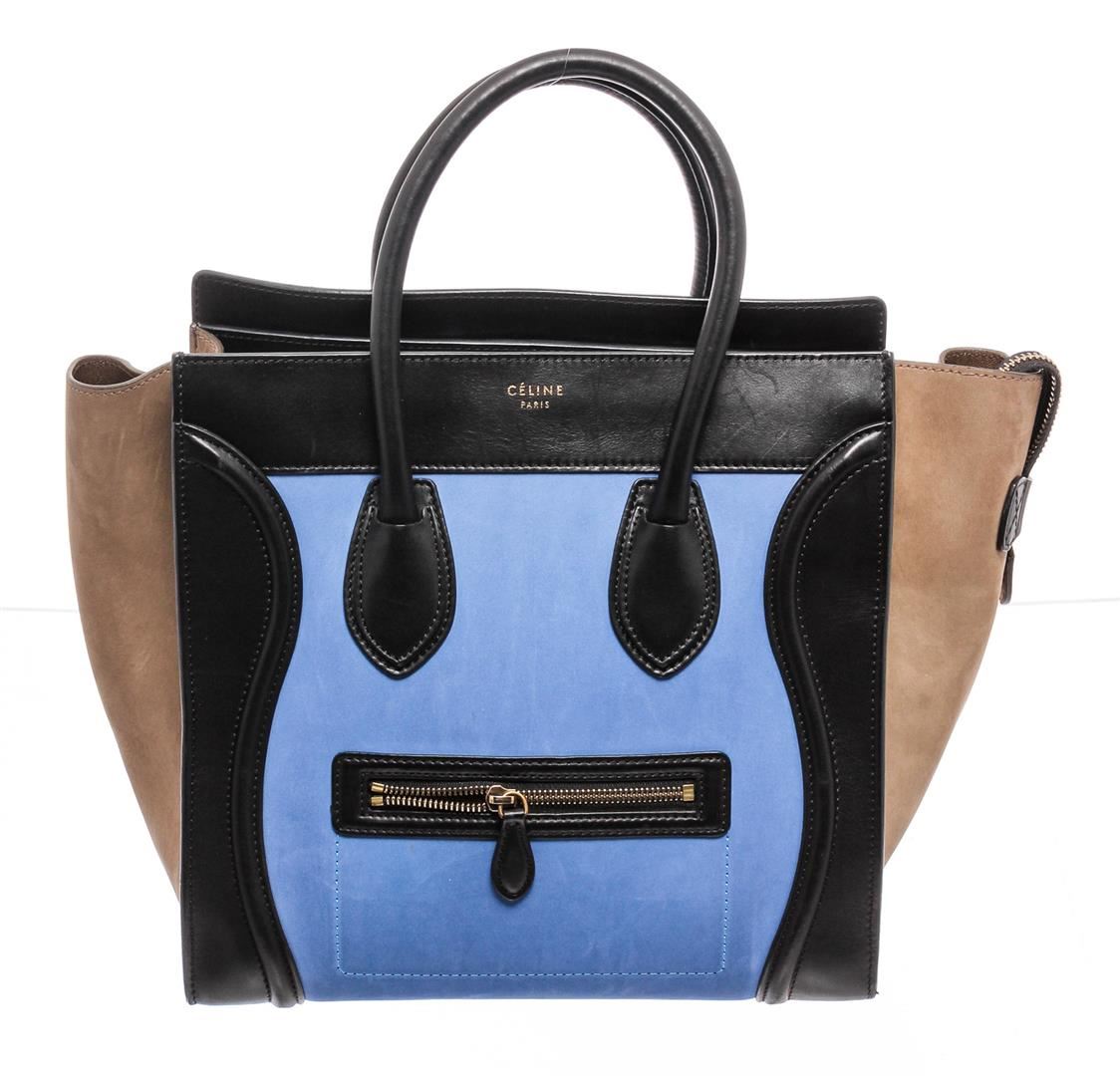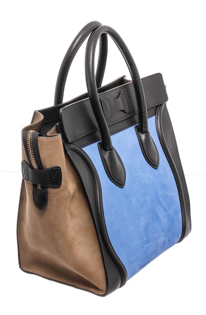 Celine cobalt blue and brown nubuck Phantom tote bag with gold-tone hardware, dual rolled top handles, single zip pocket at front, protective feet at base, brown leather lining, three interior pockets; one with zip closure and overall zip closure at top.