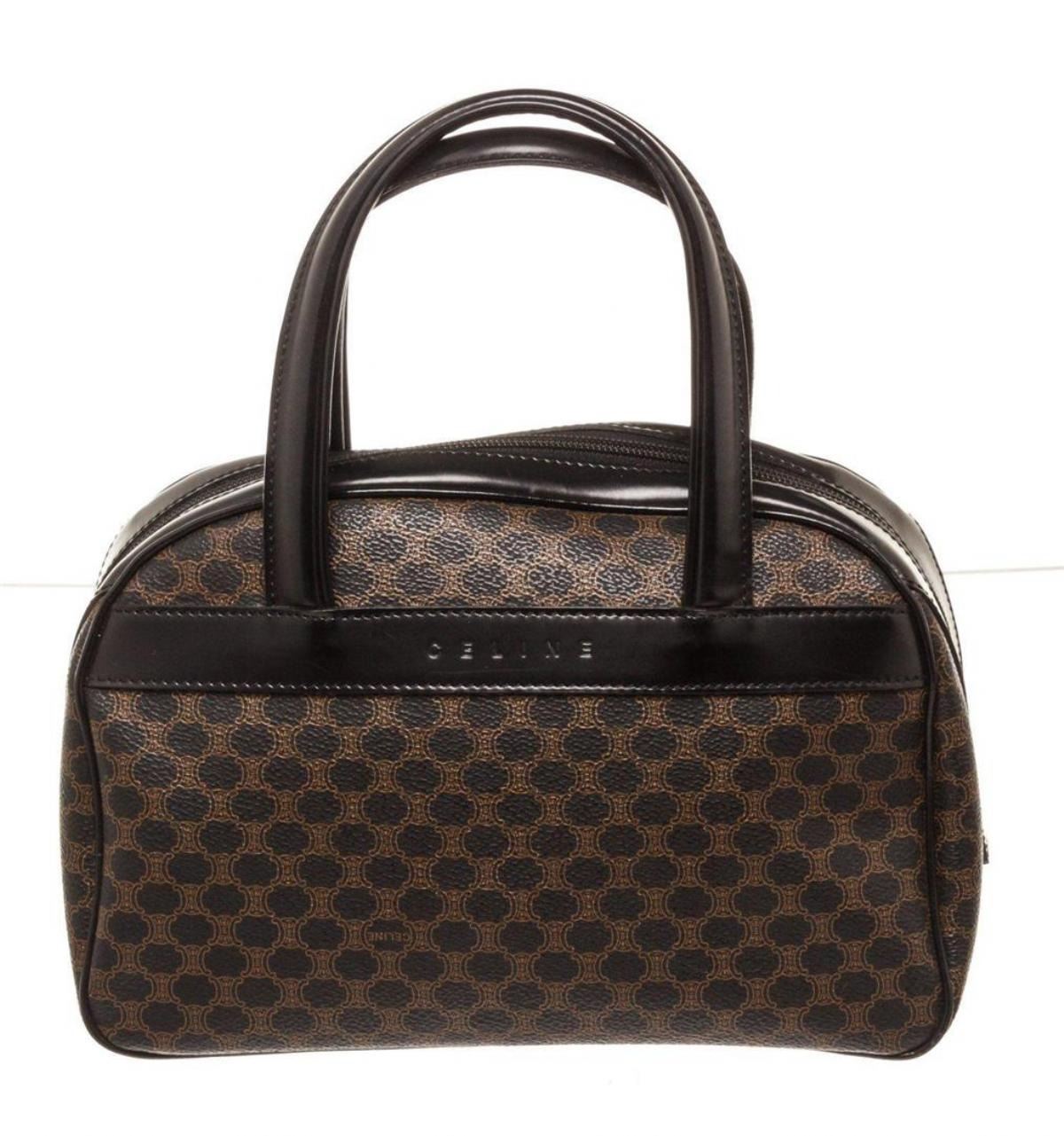Celine Black Brown Leather Small Handbag with material leather, gold-tone hardware, trim leather, interior zip pocket, dual top handle and zipper closure.