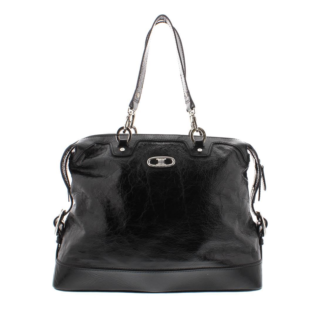 Crafted out of black distressed patent leather, silver-tone hardware, dual flat shoulder handles, and zip top closure, Inner multicolor Celine logo canvas lining and dual slip pockets. Dimensions = 14.25"x5.5"x11"x HD:7"/13.19cmx13.97cmx27.94cmx HD:17.78cm. Item is pre-owned.