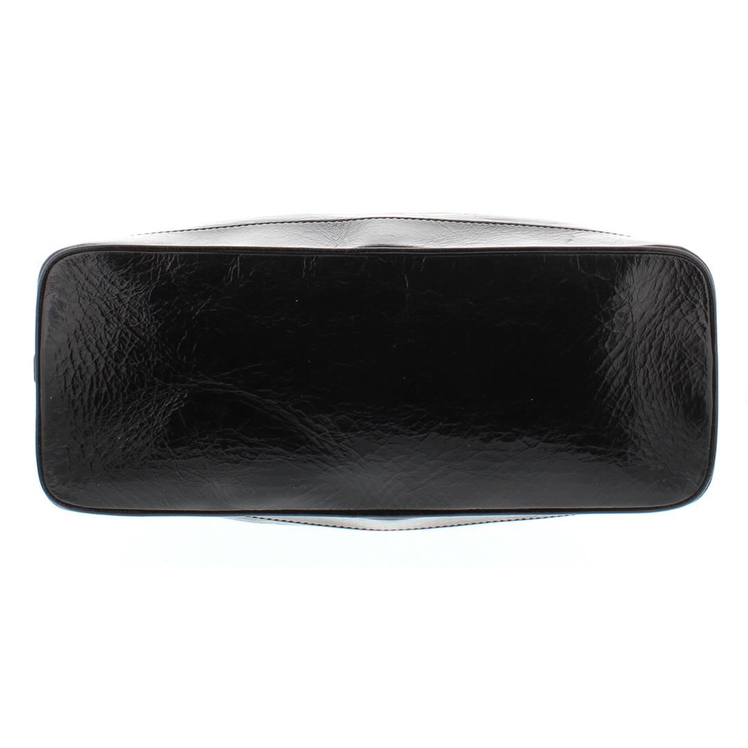 Crafted out of black distressed patent leather, silver-tone hardware, dual flat shoulder handles, and zip top closure, Inner multicolor Celine logo canvas lining and dual slip pockets. Dimensions = 14.25"x5.5"x11"x HD:7"/13.19cmx13.97cmx27.94cmx HD:17.78cm. Item is pre-owned.
