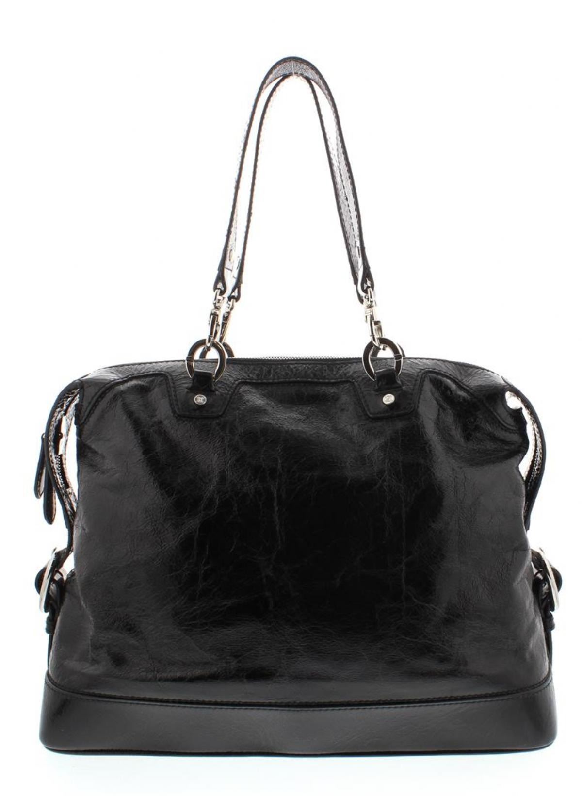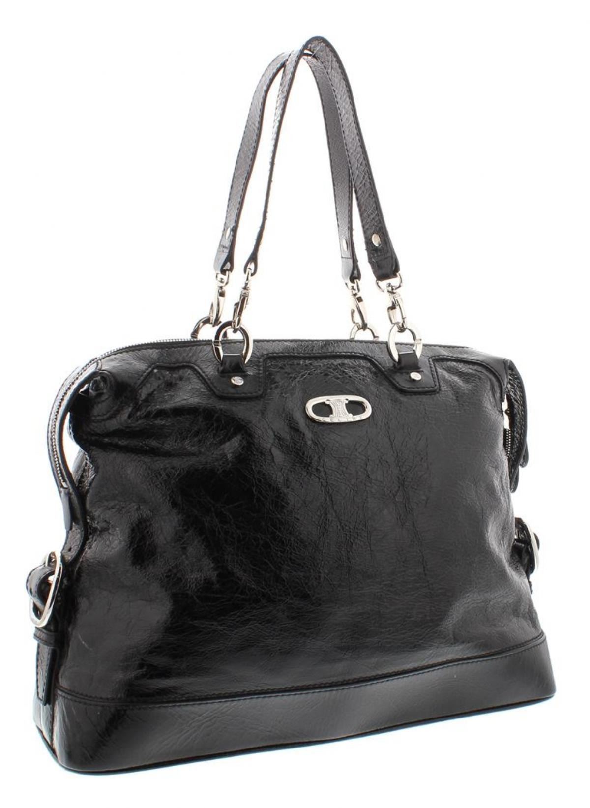 One Celine Black Distressed Patent Leather Shoulder Handbag. Crafted out of black distressed patent leather, silver-tone hardware, dual flat shoulder handles, and zip top closure, Inner multicolor Celine logo canvas lining and dual slip pockets.