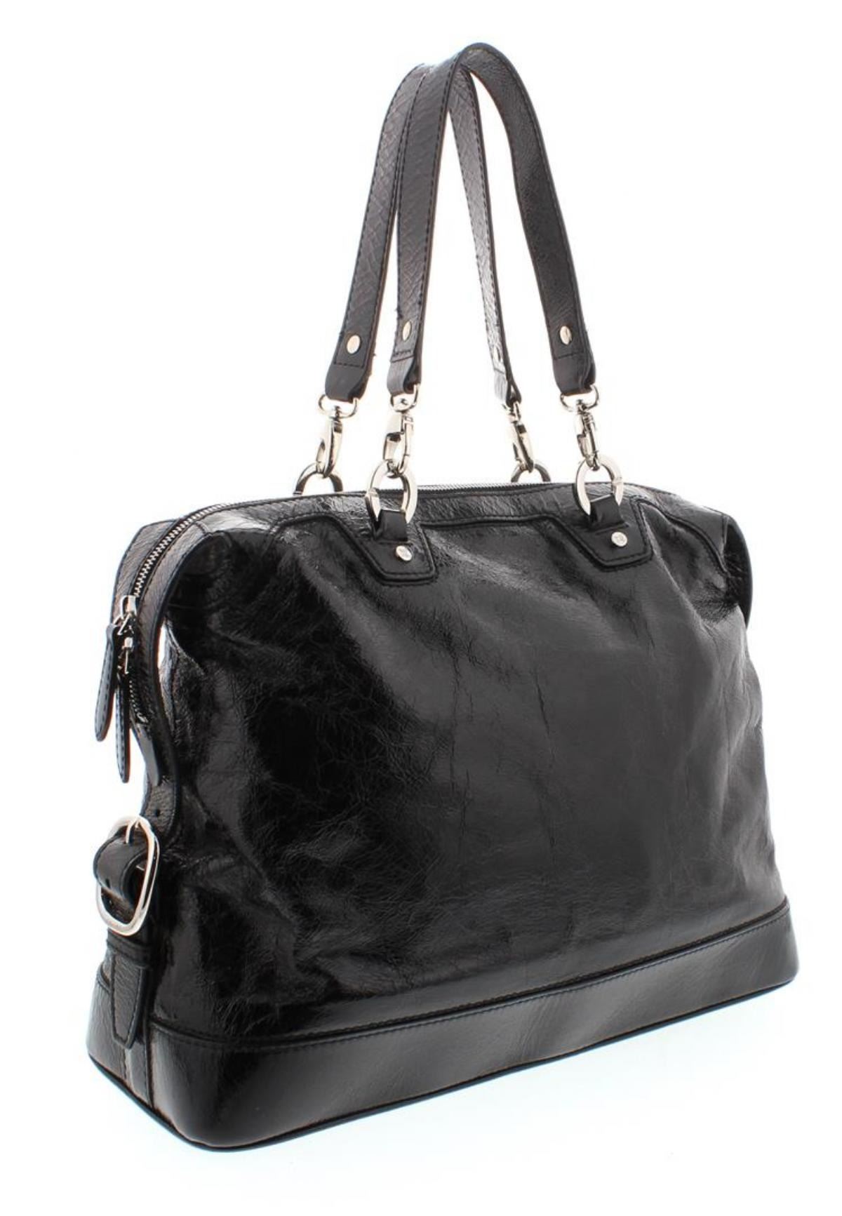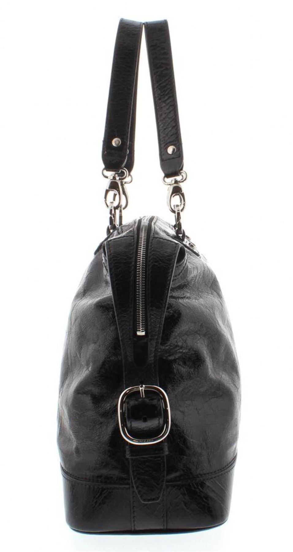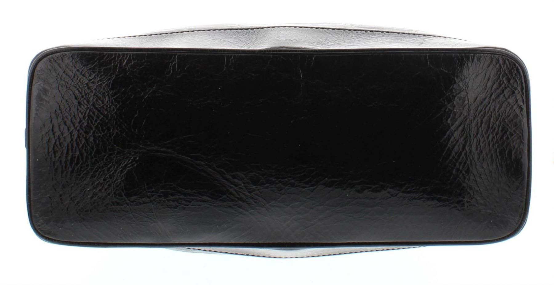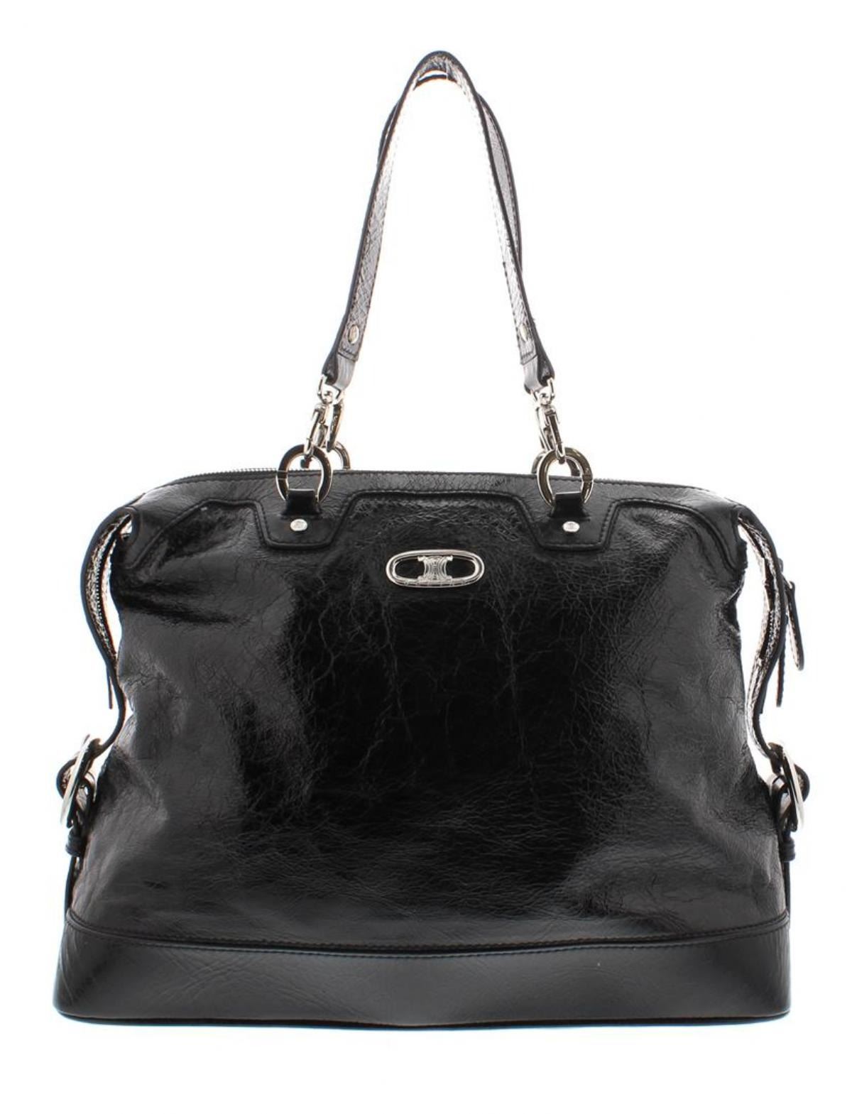 One Celine Black Distressed Patent Leather Shoulder Handbag. Crafted out of black distressed patent leather, silver-tone hardware, dual flat shoulder handles, and zip top closure, Inner multicolor Celine logo canvas lining and dual slip pockets.