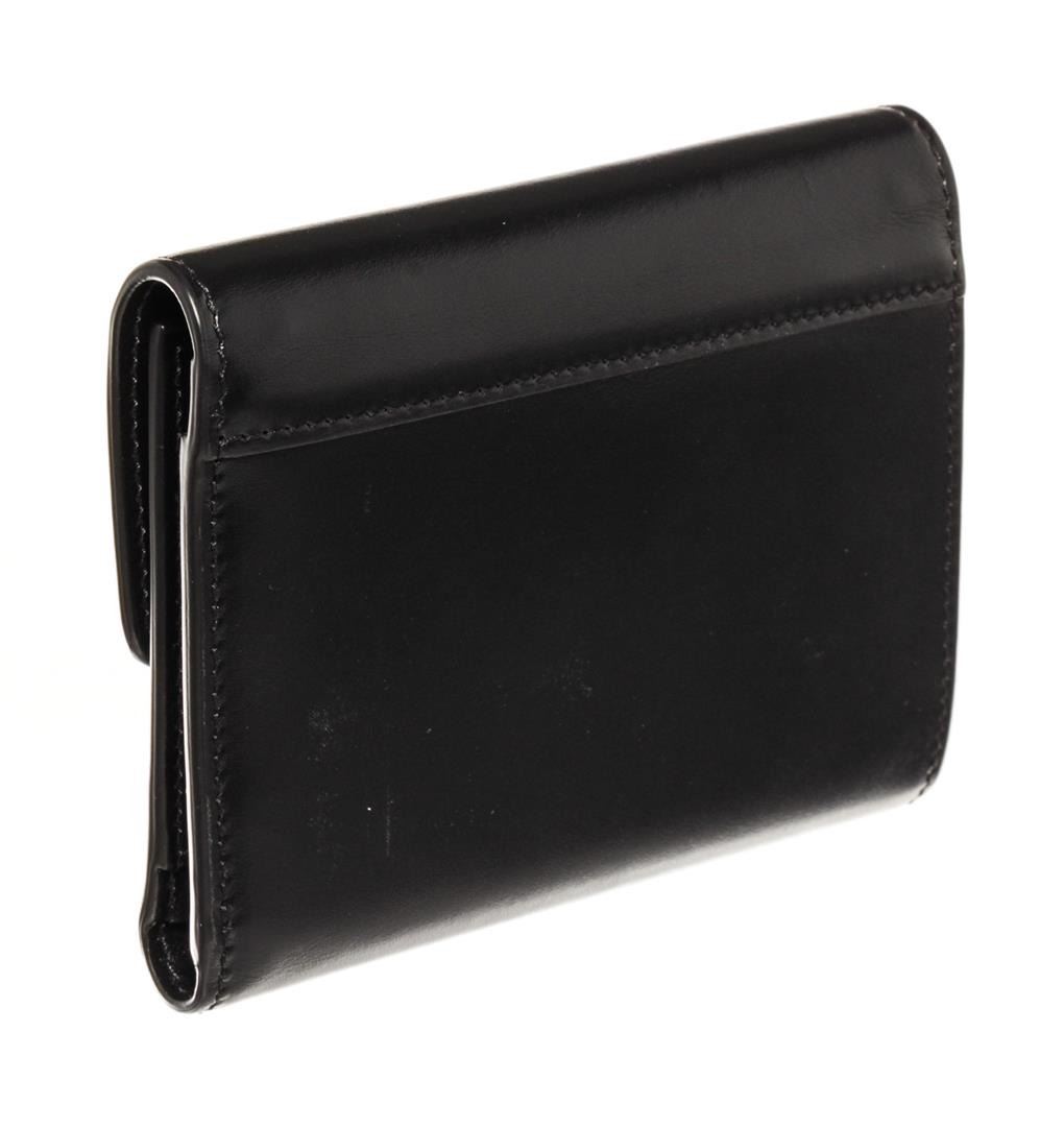Black leather Celine C Flap small wallet with gold-tone hardware, signature C push-lock at front, black leather lining, compartment for noted or bills, three card slots and one zip pocket inside. Height 3.5", Width 4.5", Depth 1"