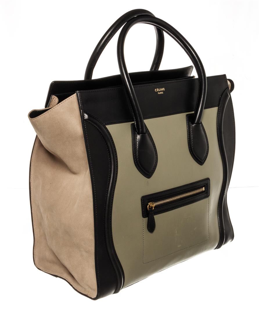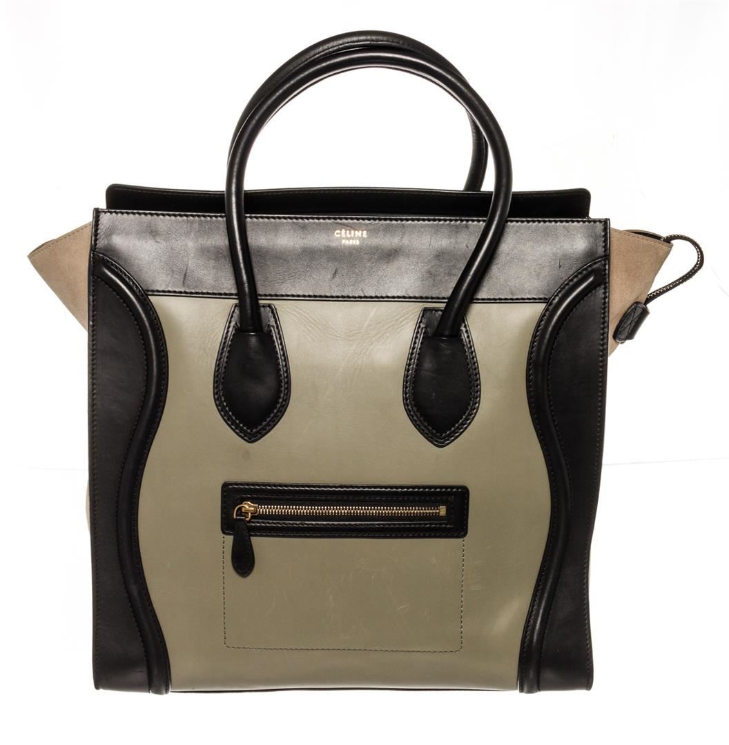 One Celine Black Multicolor Suede Leather Micro Luggage Handbag. Item is sold AS-IS. All available information is listed in the description and shown in the photo. Celine Multicolor Mini Luggage with black and gray leather, beige suede, gold-tone hardware, dual rolled top handles, single zip pocket and foil-stamped logo at front face, protective feet at base, black leather lining, three pockets at interior walls; one with zip closure and zip closure at top. Height 10", Width 10", Depth 5", Handle Drop 23"