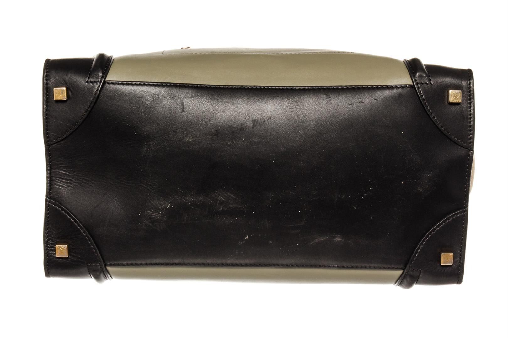 One Celine Black Multicolor Suede Leather Micro Luggage Handbag. Item is sold AS-IS. All available information is listed in the description and shown in the photo. Celine Multicolor Mini Luggage with black and gray leather, beige suede, gold-tone hardware, dual rolled top handles, single zip pocket and foil-stamped logo at front face, protective feet at base, black leather lining, three pockets at interior walls; one with zip closure and zip closure at top. Height 10", Width 10", Depth 5", Handle Drop 23"
