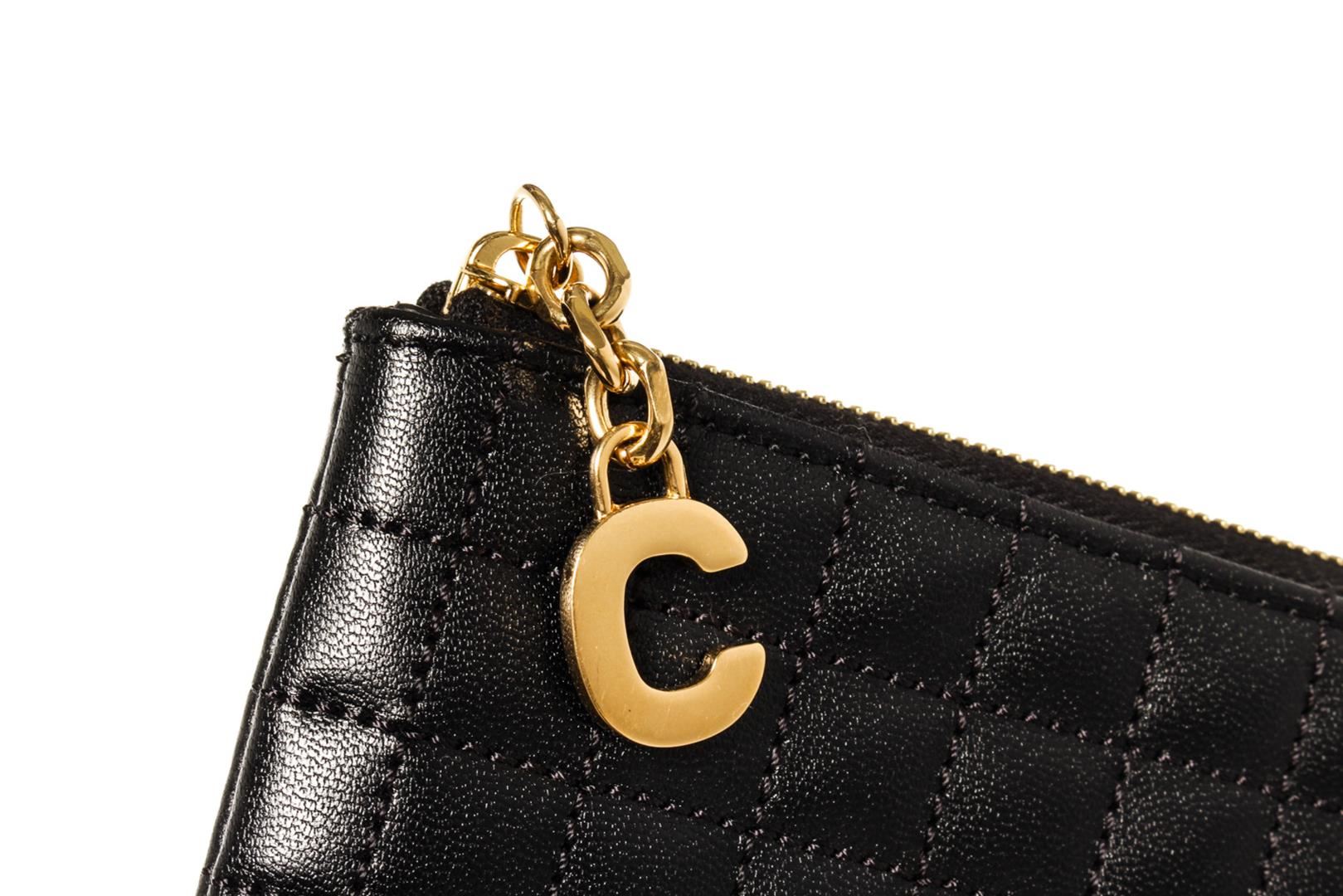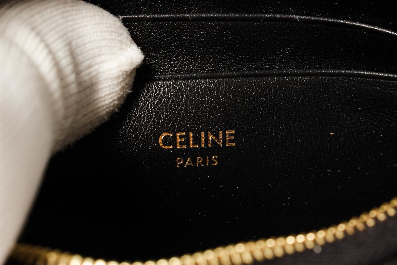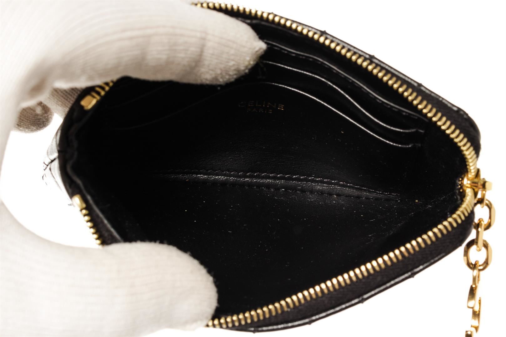 One Celine Black Quilted Calfskin Leather C Charm Coin and Card Pouch. Item is sold AS-IS. All available information is listed in the description and shown in the photo. Black quilted Calfskin leather Celine Black C Charm coin and card pouch with gold-tone metal hardware, zipped closure at top with C charm attached to the puller, two card slots and black Calfskin leather lining. 5 x 4 x 0.5 inches 5 x 4 x 0.5 inches