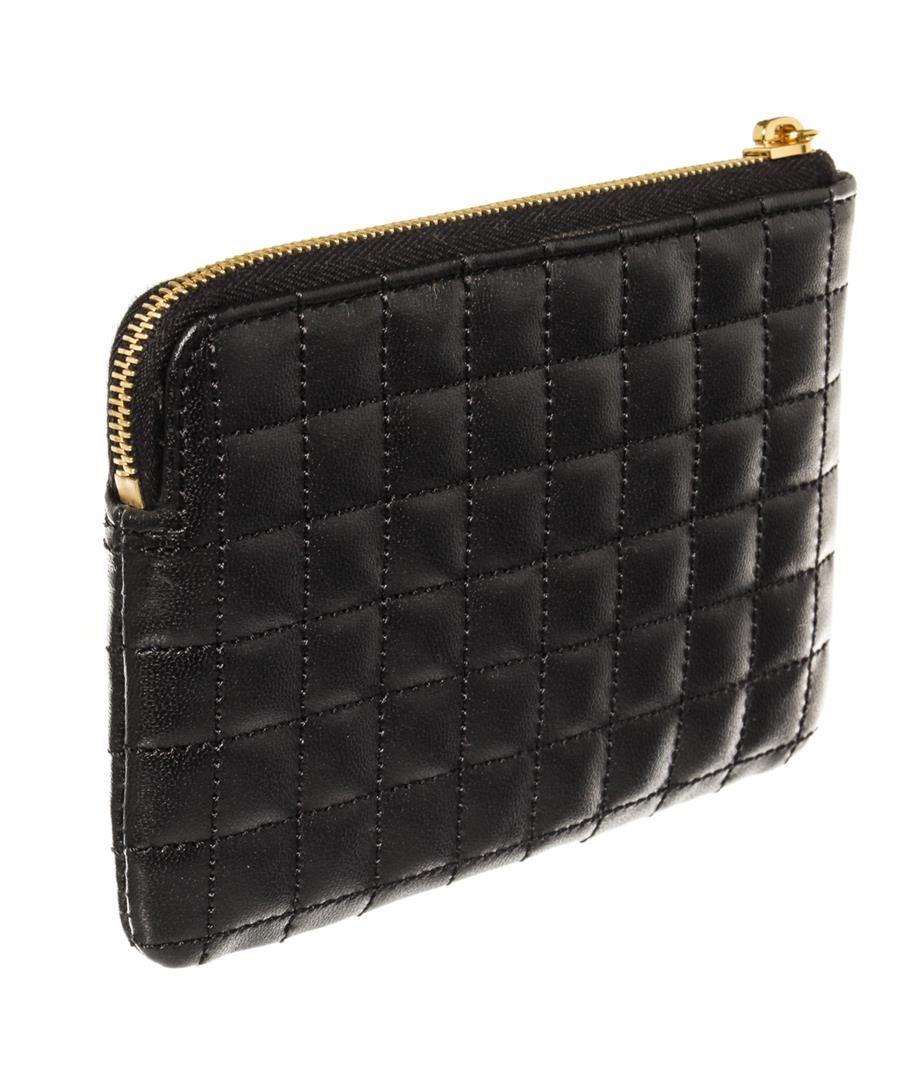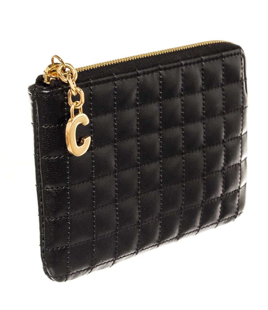 One Celine Black Quilted Calfskin Leather C Charm Coin and Card Pouch. Item is sold AS-IS. All available information is listed in the description and shown in the photo. Black quilted Calfskin leather Celine Black C Charm coin and card pouch with gold-tone metal hardware, zipped closure at top with C charm attached to the puller, two card slots and black Calfskin leather lining. 5 x 4 x 0.5 inches 5 x 4 x 0.5 inches