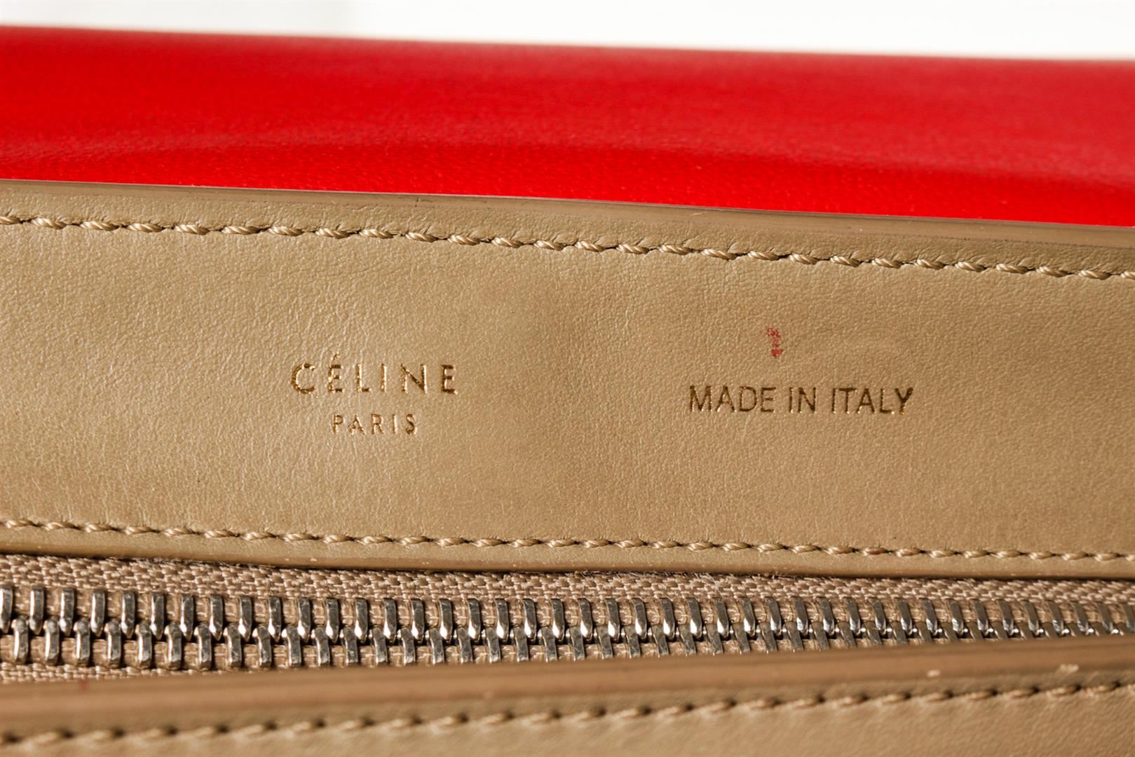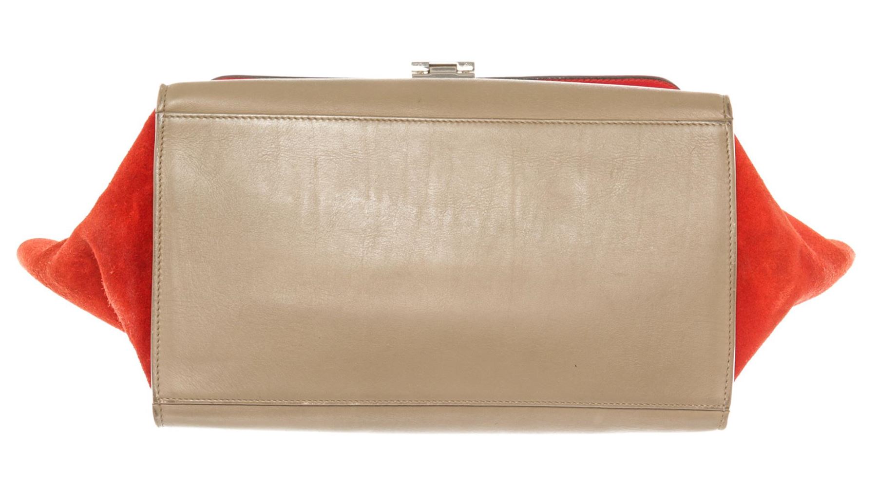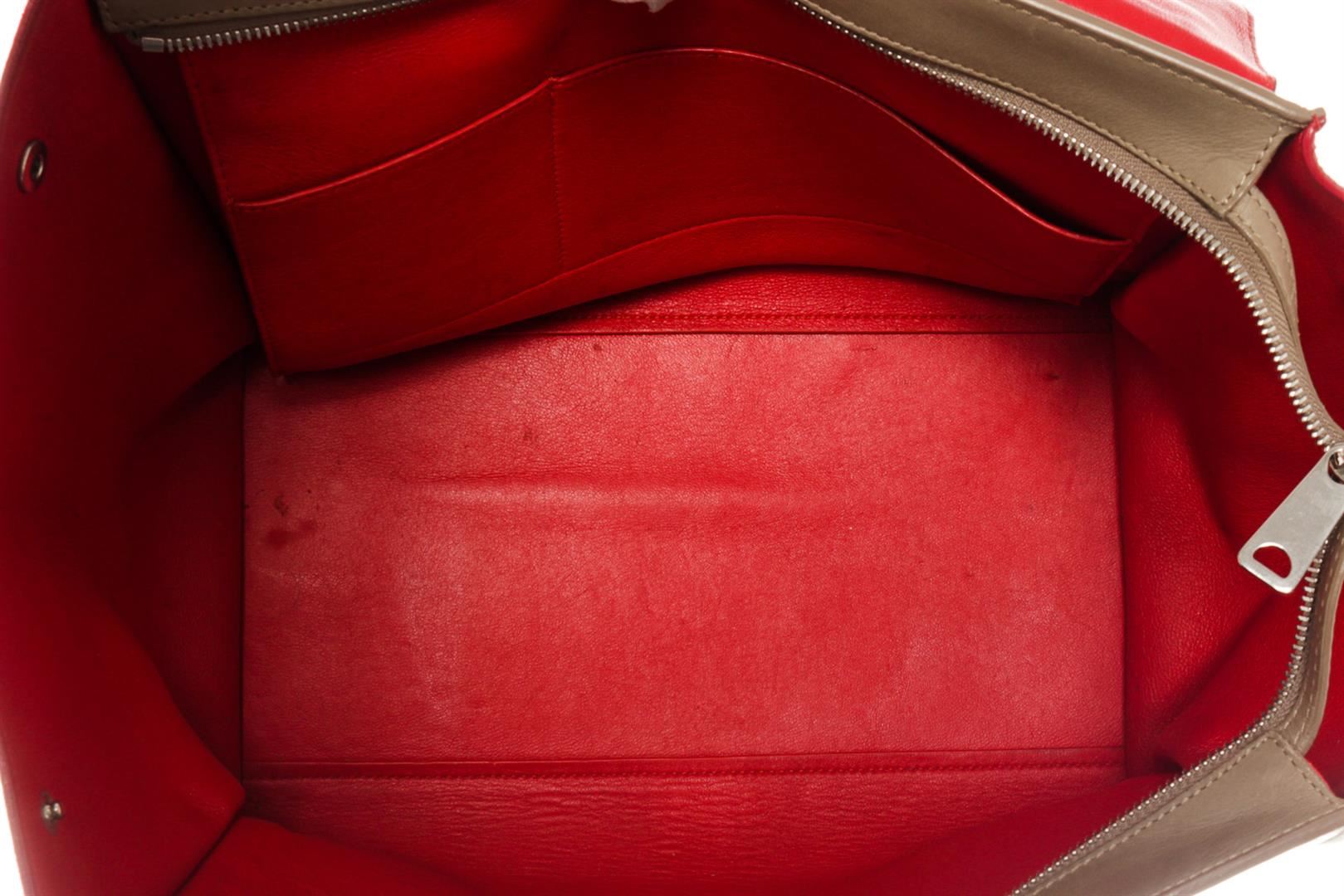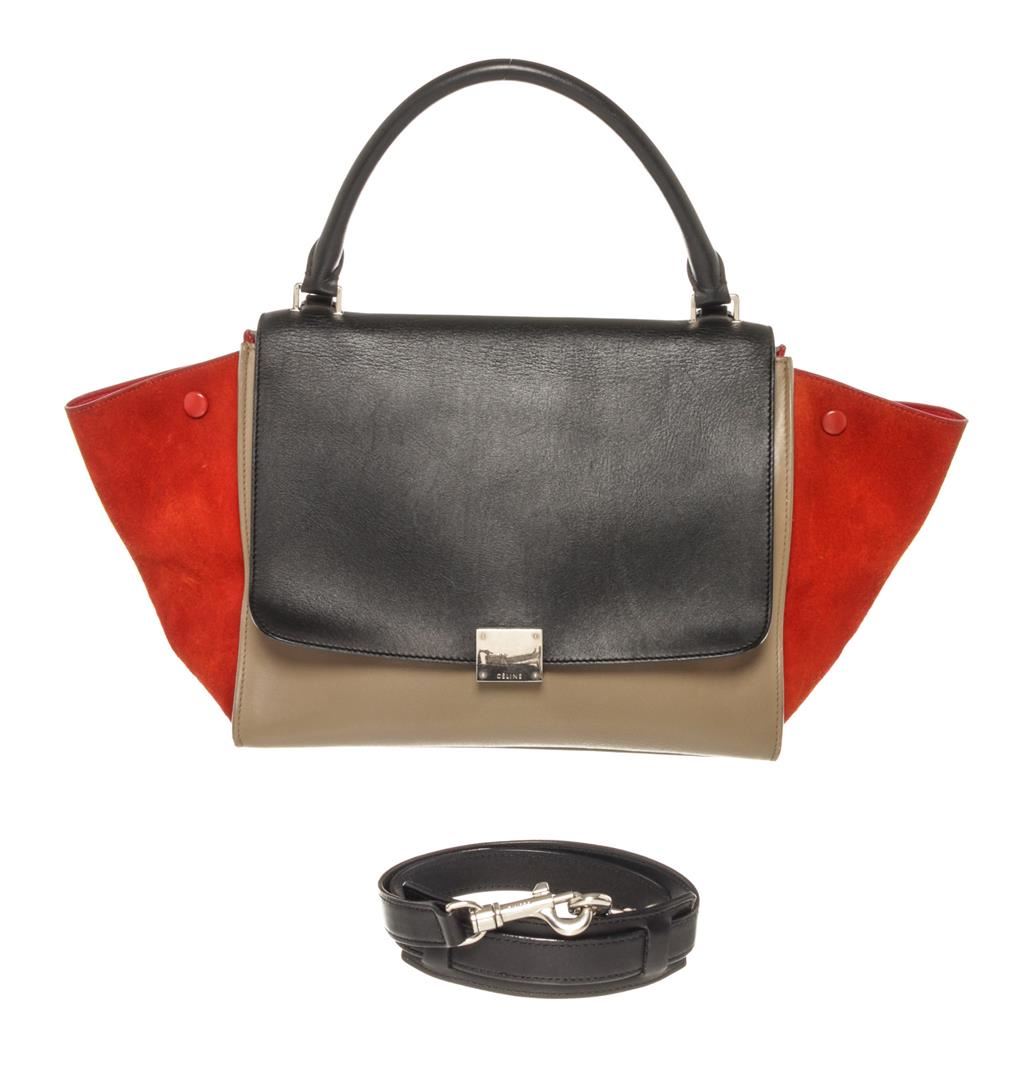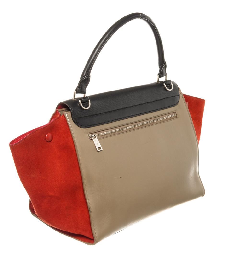Black and gray leather with red suede Celine Trapeze bag with silver-tone hardware, single rolled top handle, dual side gussets with snap expansions, exterior zip pocket at back, tonal leather lining, dual interior slit pockets and flip-lock closure at fr