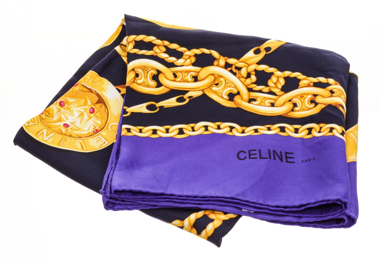 Celine purple, navy blue, and gold silk scarf with chain-link belt illustrations.