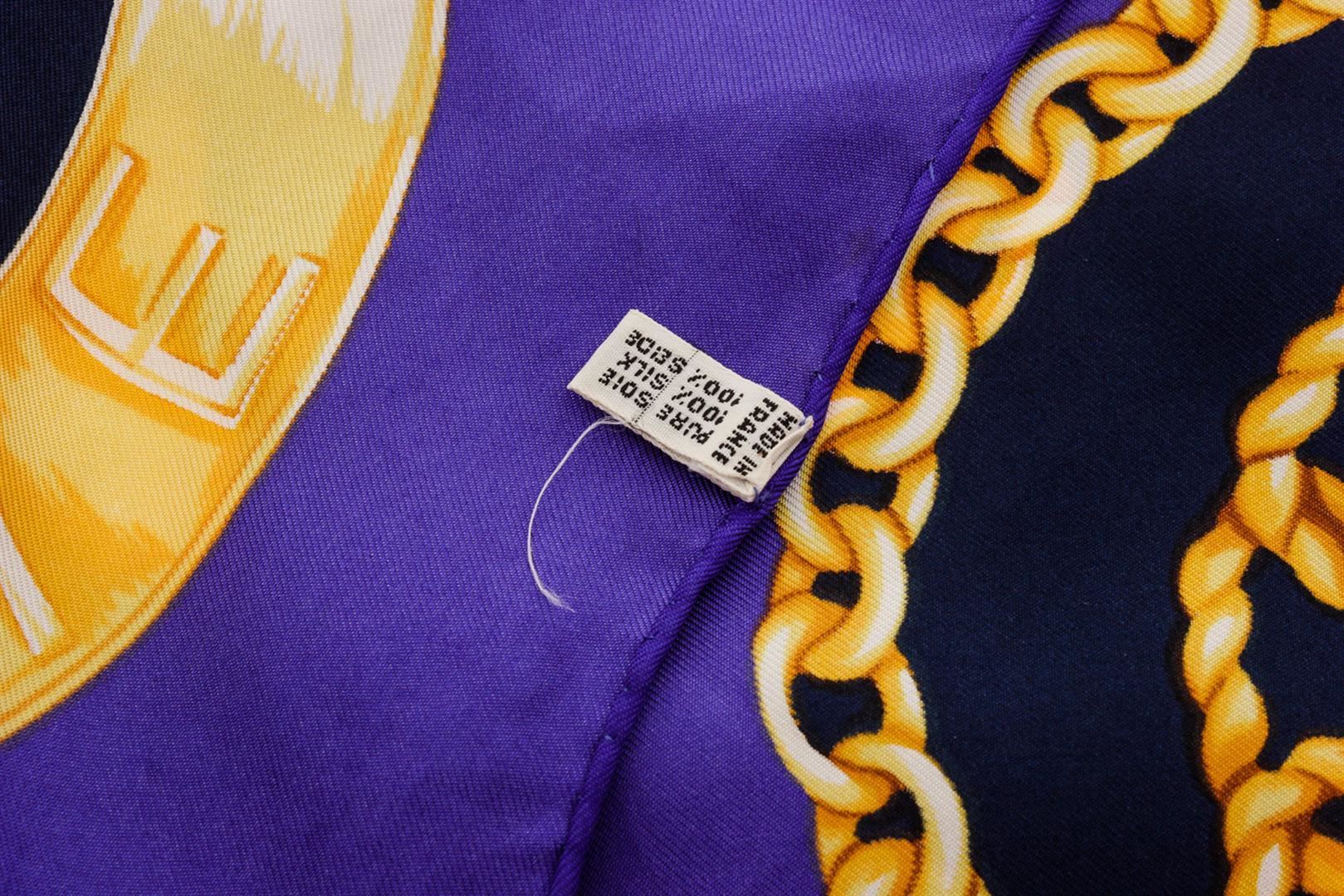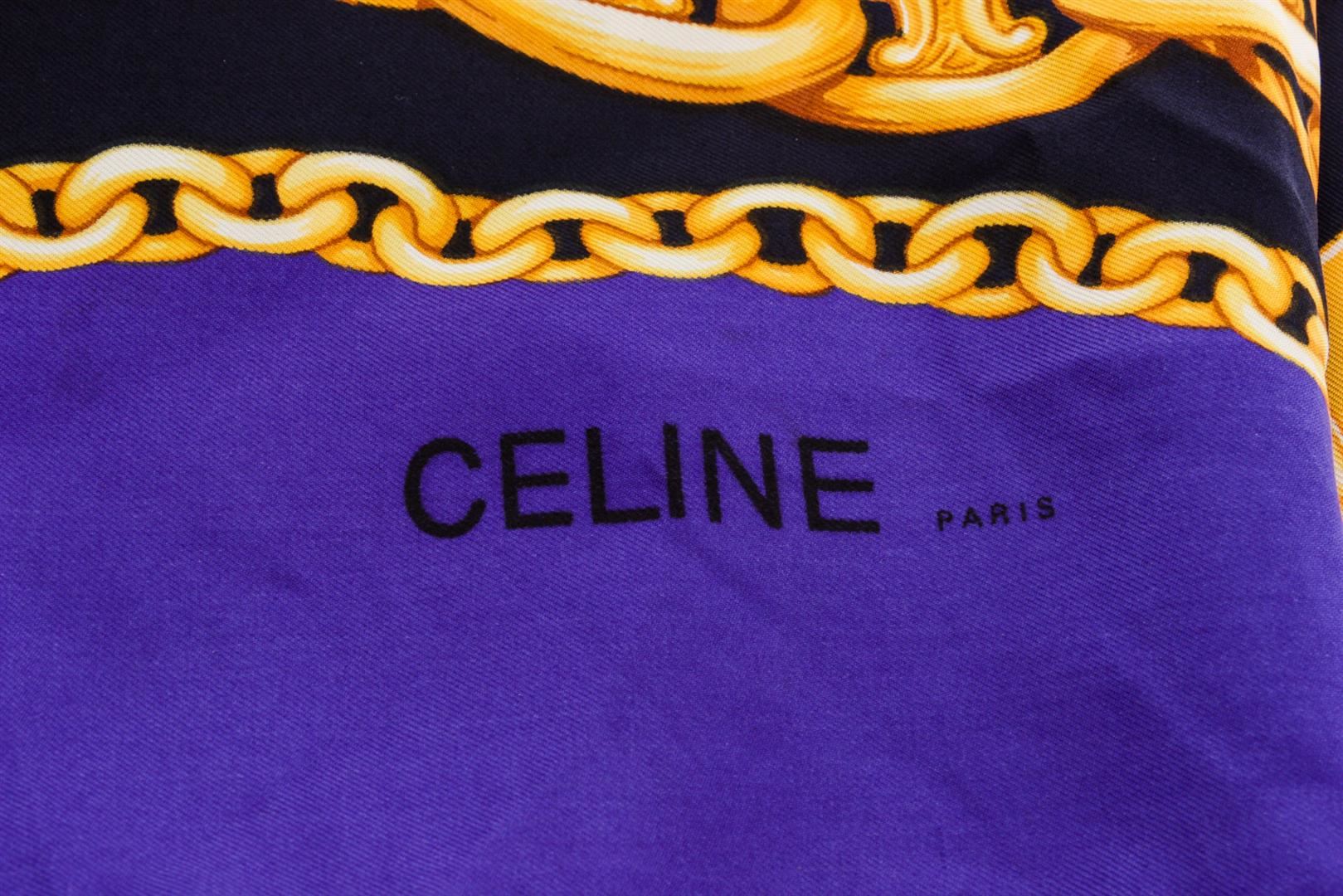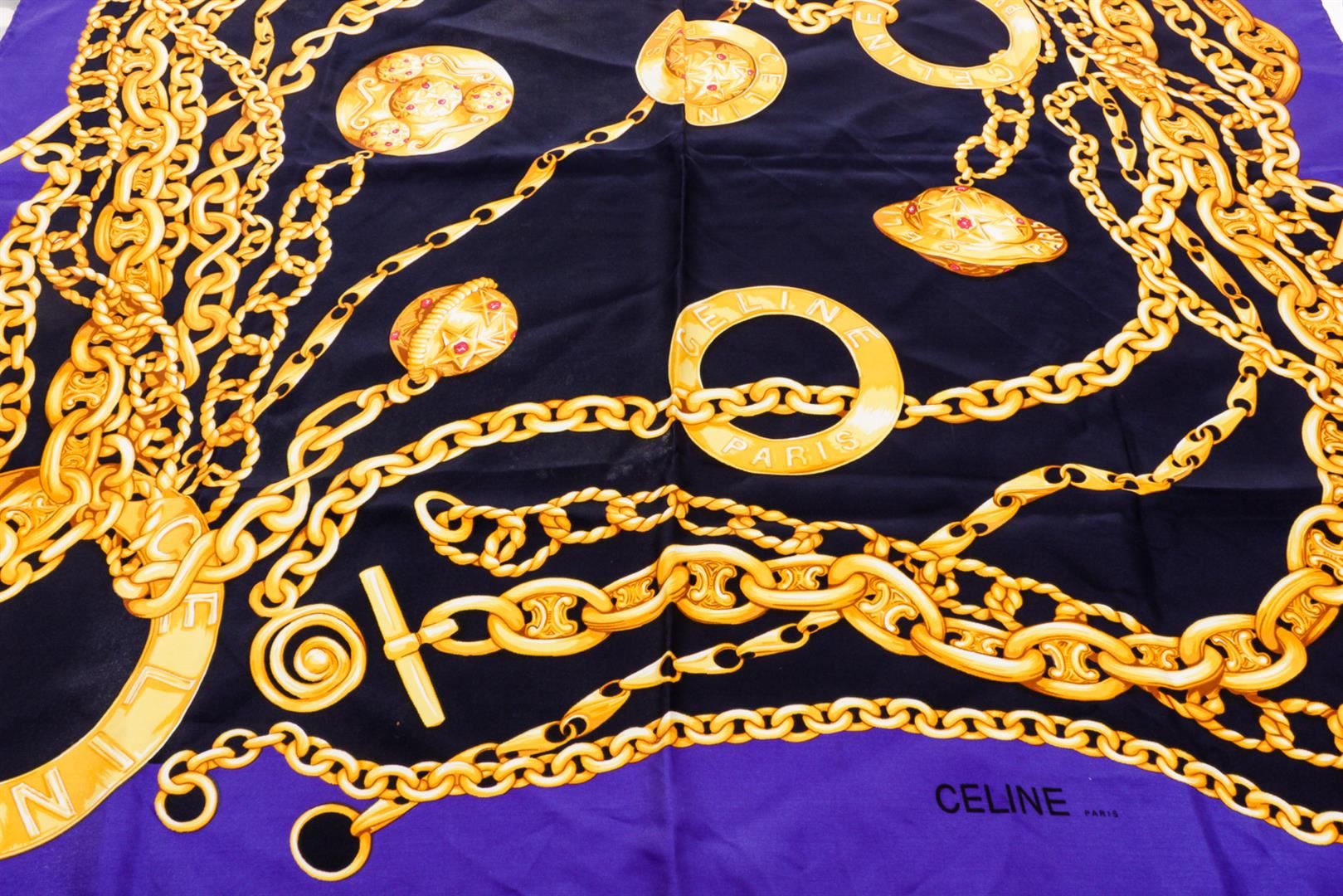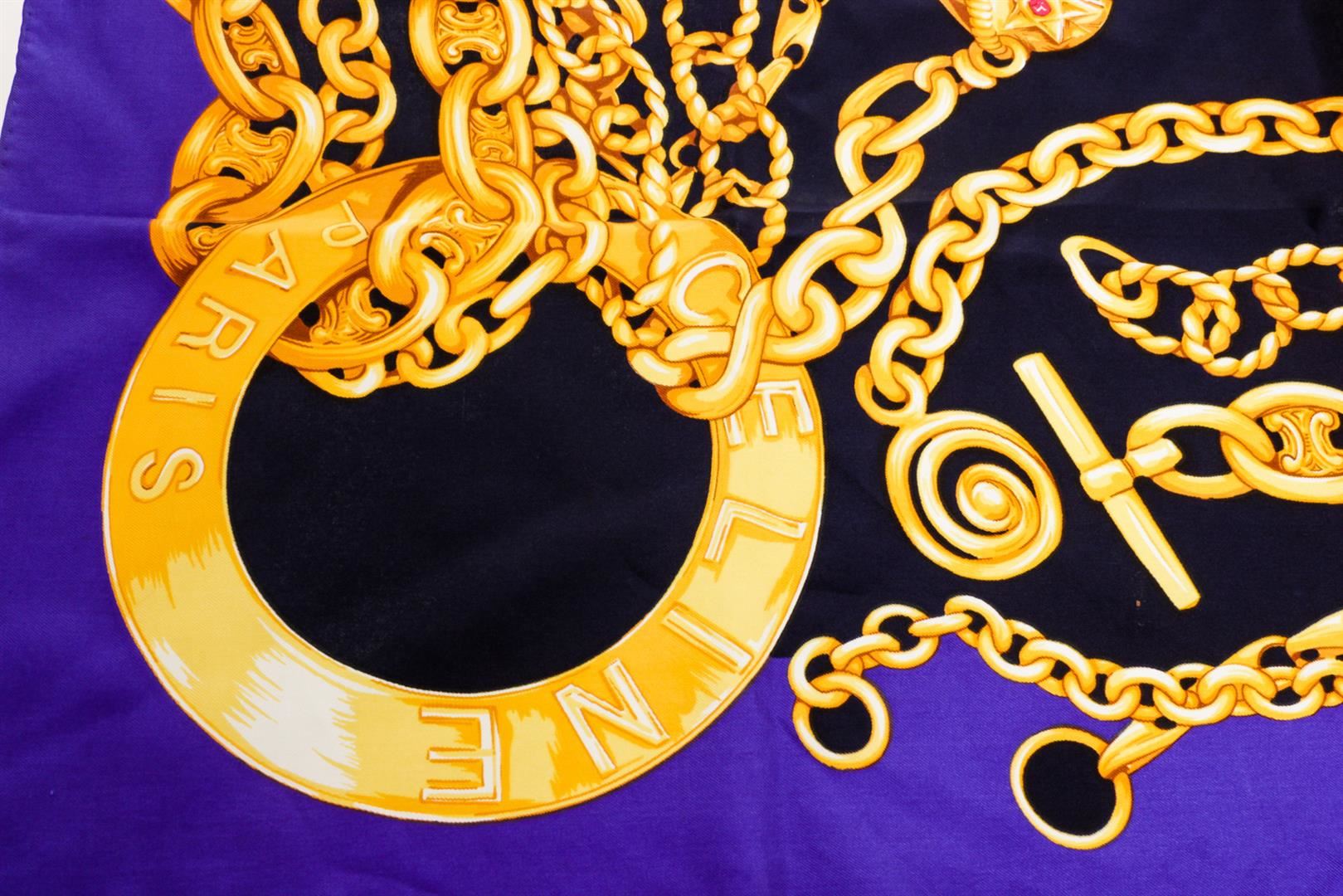Celine purple, navy blue, and gold silk scarf with chain-link belt illustrations.