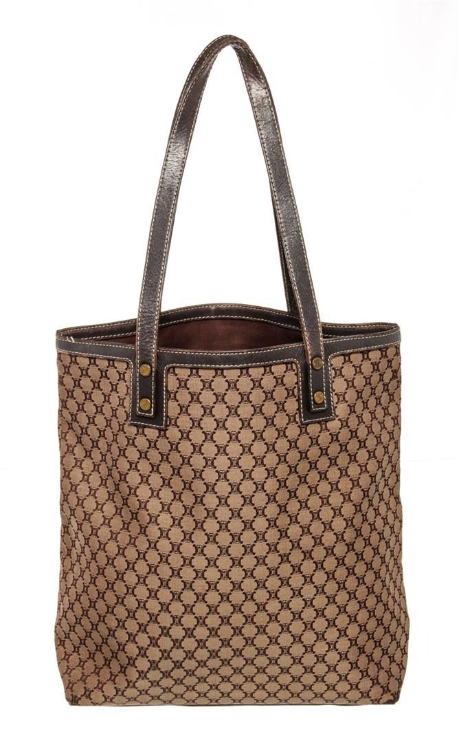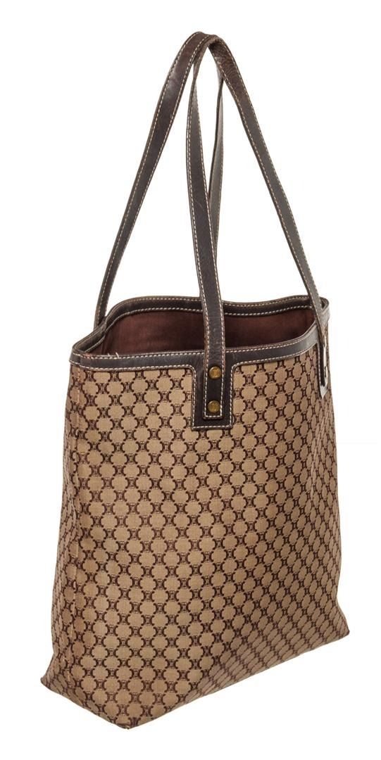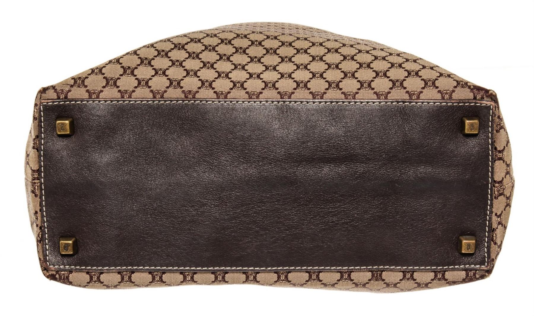 One Celine Brown Beige Canvas Macadam Tote Bag. Item is sold AS-IS. All available information is listed in the description and shown in the photo. Brown and beige canvas Celine Macadam tote bag with gold-tone hardware, protective feet at base, dual flat handles, brown leather trim, an open top, brown canvas lining, one zip pocket and one slip pocket inside. W:15.3" x H:14.5" x D:3.14"/ Handle/Shoulder Drop: ~12"