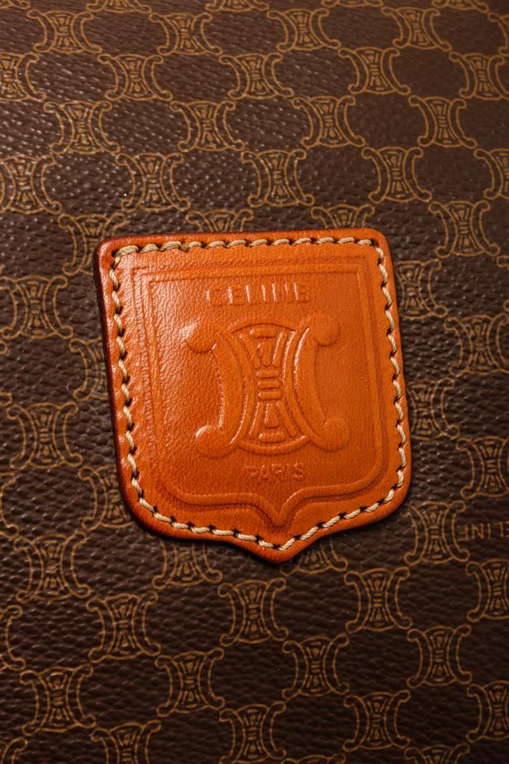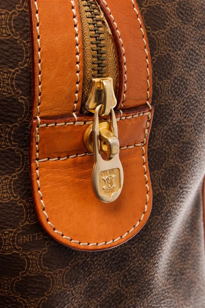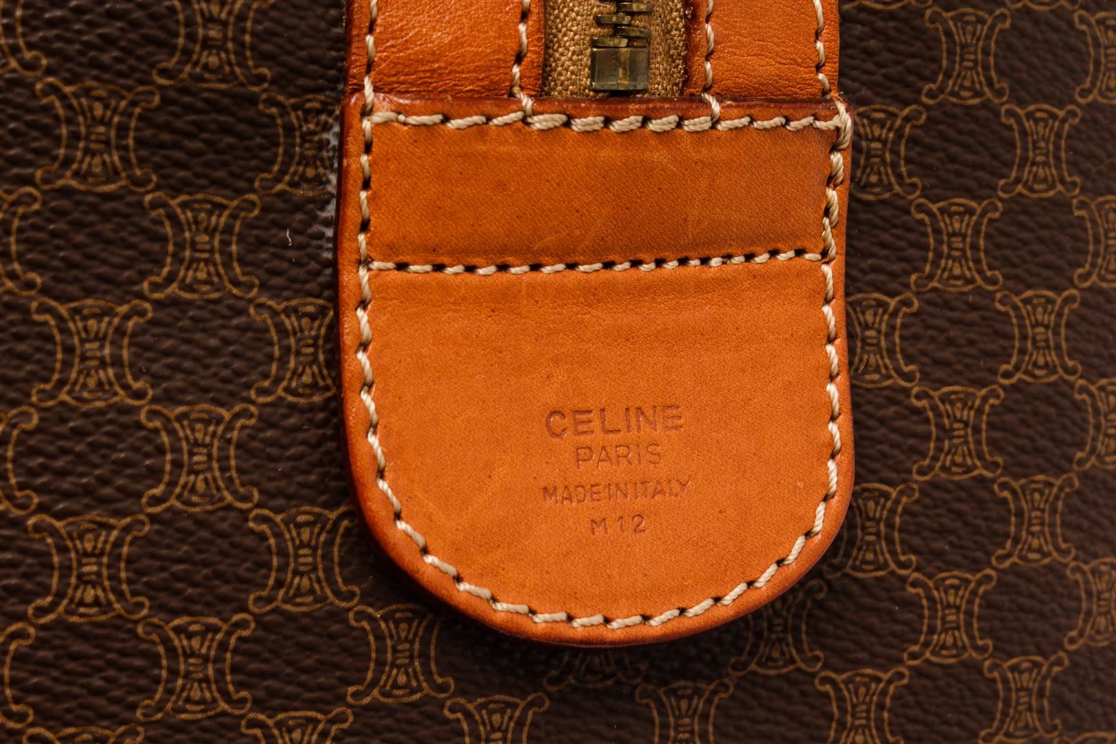 Celine Brown Canvas Leather Macadam Travel Bag. All available information is listed in the description and shown in the photos. Celine Brown Canvas Leather Macadam Travel Bag with paisley print, brass hardware, rolled handles, leather trim embellishment, canvas lining & single interior pocket, zip closure at top. Height: 9.25" Width: 17" Depth: 9.5", Handle Drop: 6.25" / 23.49 x 43.18 x 24.13 Cm