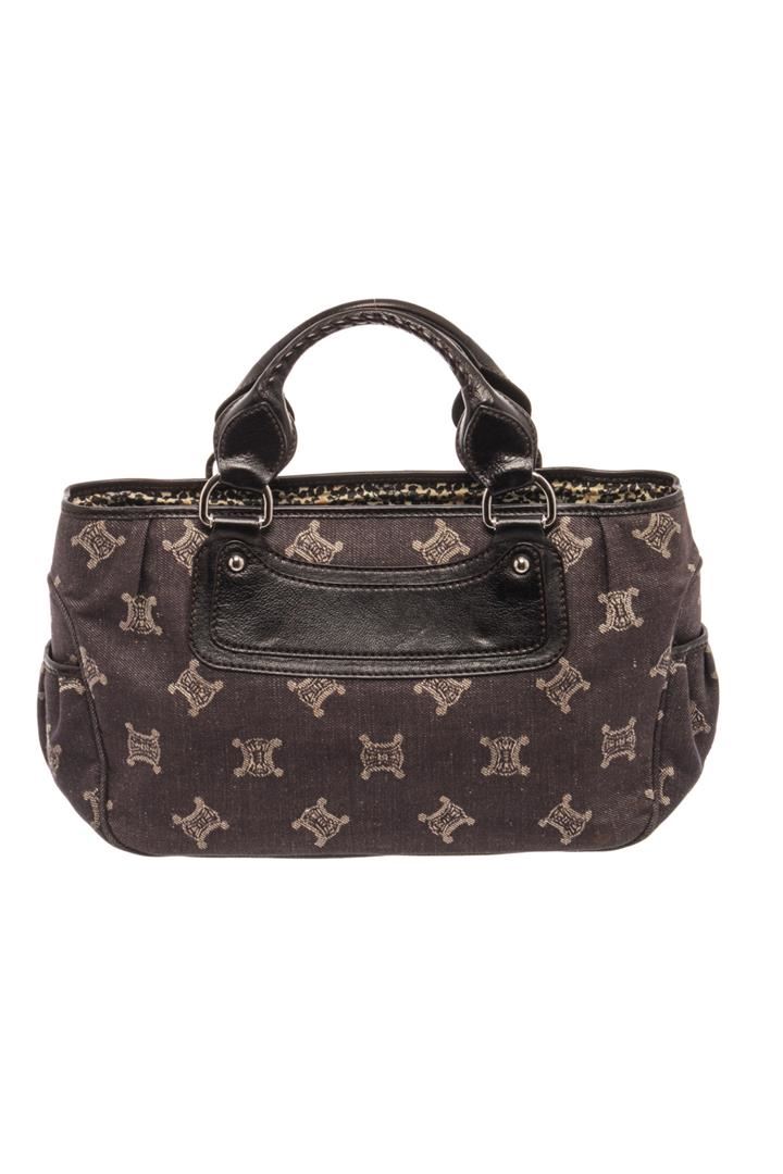 Celine Brown Denim Vintage Macadam Boogie Bag. All available information is listed in the description and shown in the photos. Celine Brown Denim Vintage Macadam Boogie Bag with printed, silver-tone hardware, rolled handles, leather trim embellishment, canvas lining & three interior pockets, open top Height: 7.75", Width: 13.75", Depth: 5.5" / 19.68 x 34.92 x 13.97 CM