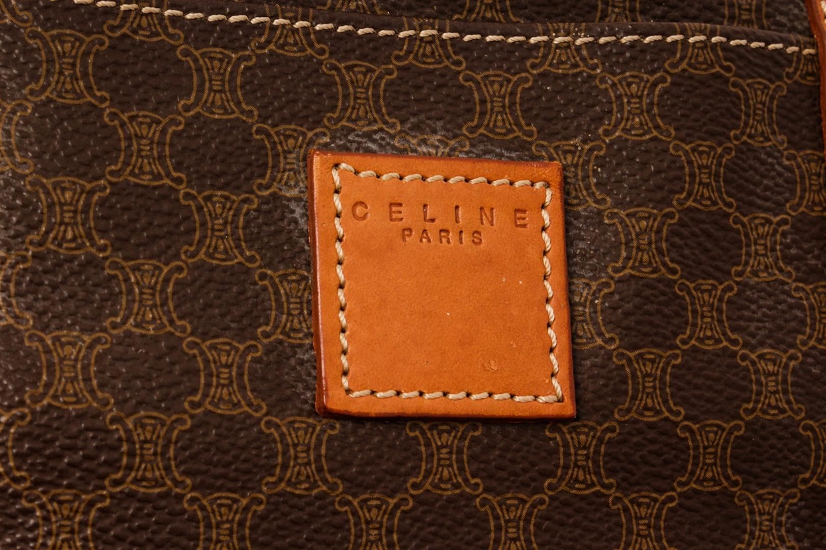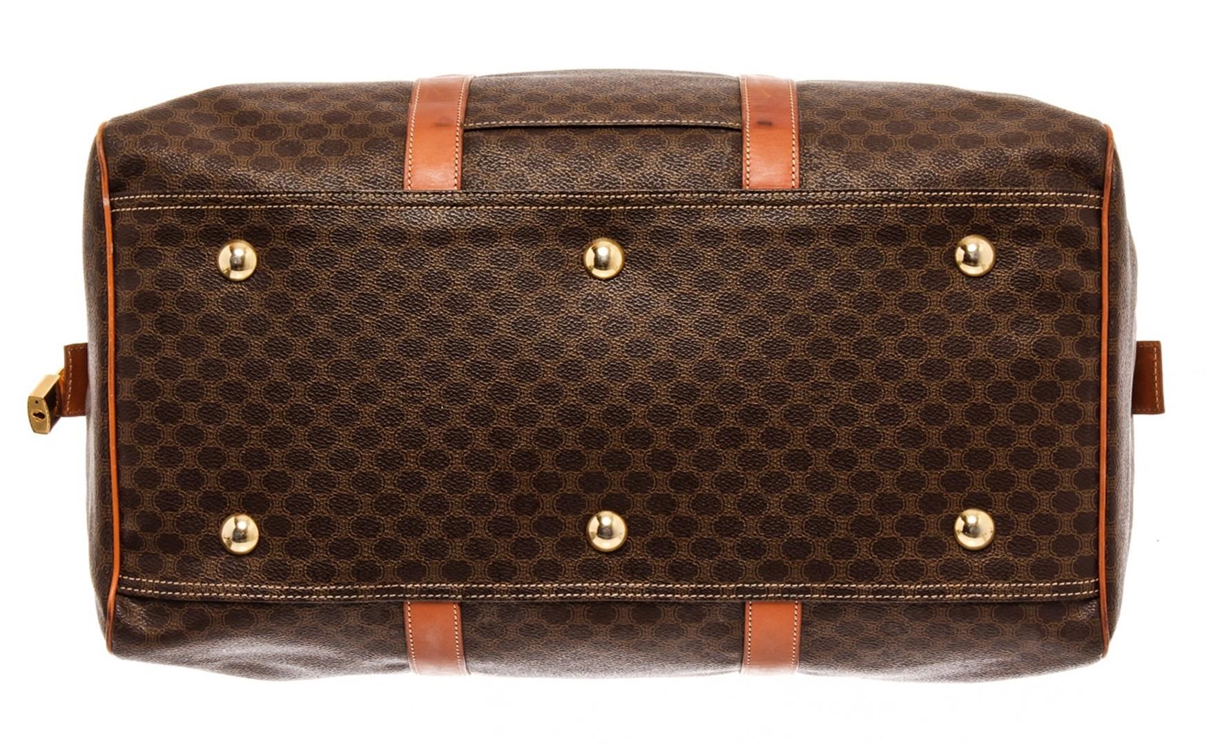 Celine Brown Leather Macadam Boston Bag. All available information is listed in the description and shown in the photos. Celine Brown Leather Macadam Boston Bag with this bag features a pvc body with leather trim, vintage, brown printed, gold-tone hardware, canvas lining, rolled leather handles, a top zip closure, and an interior zip pocket. 7.9" L x 15.4" W x 7.1" D, Drop: 3.5" / 20.06 x 39.11 x 18.03 Cm