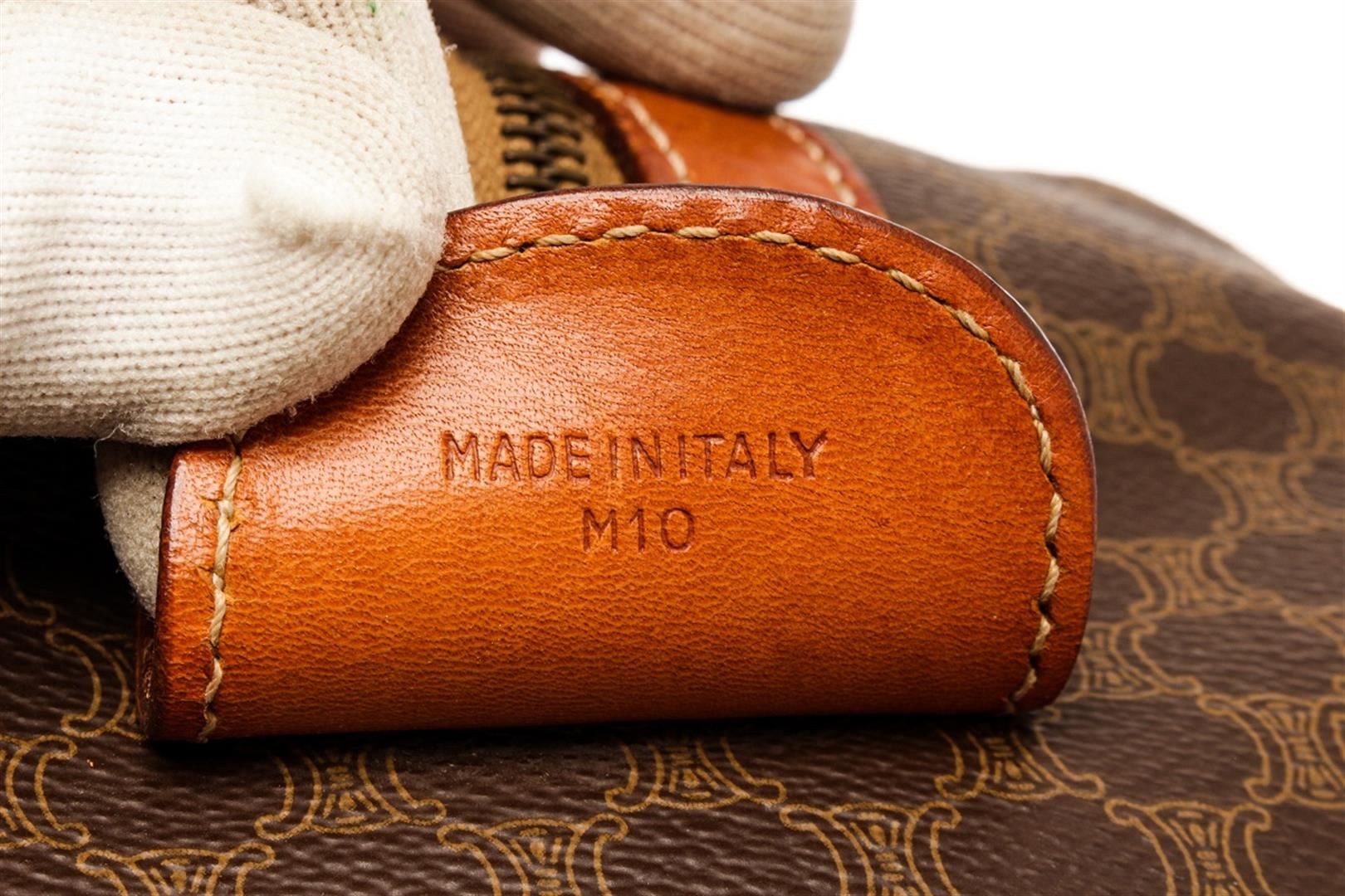 Celine Brown Leather Macadam Duffle Bag. All available information is listed in the description and shown in the photos. Celine Brown Leather Macadam Duffle Bag with this duffle bag features vintage, brown printed, brass hardware, leather trim, dual rolled handles, leather trim embellishment, canvas lining, zip closure at top. Height: 9.75" Width: 17.75" Depth: 8.5", Handle Drop: 5.75" / 24.76 x 45.08 x 21.59 Cm