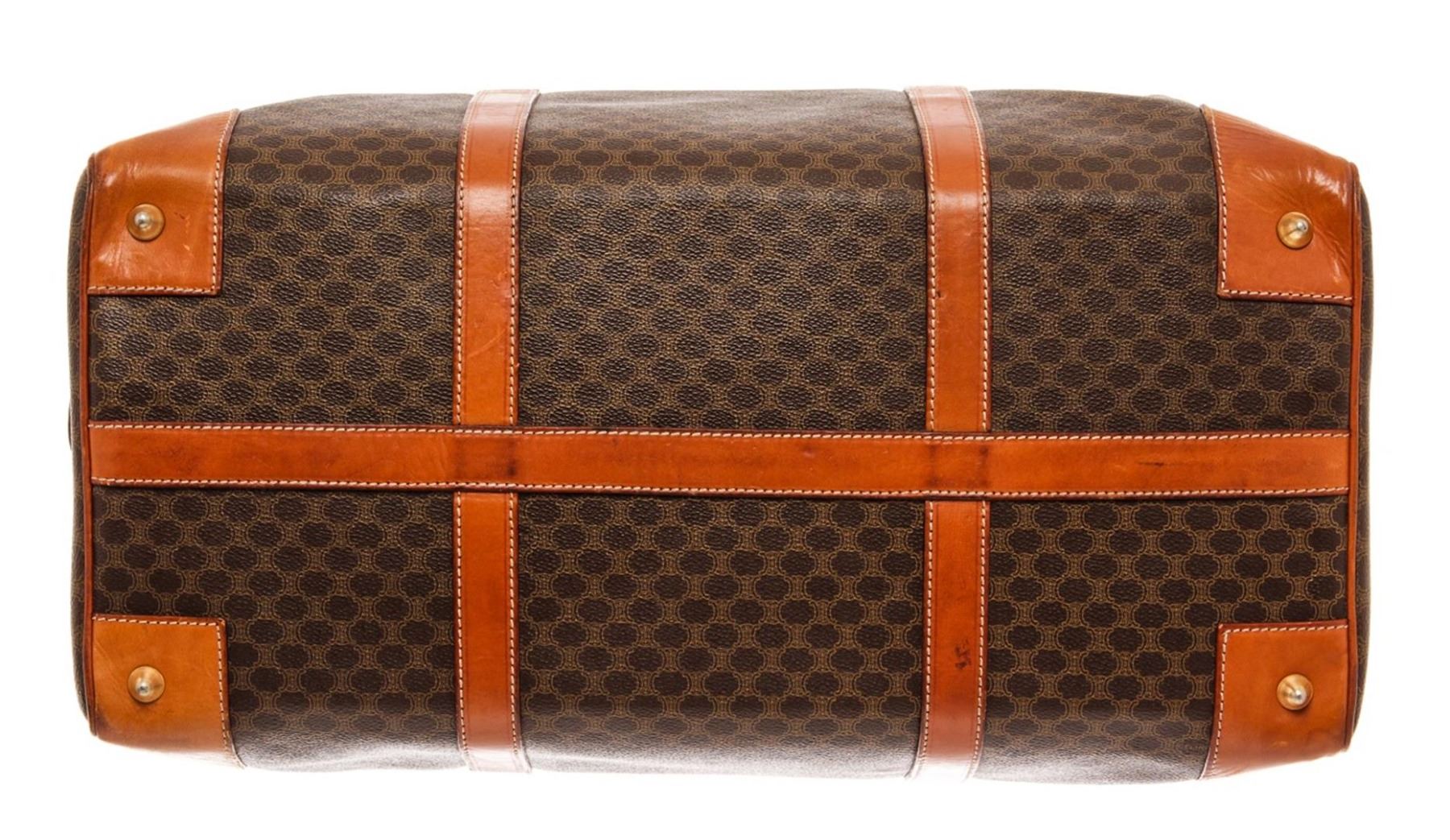 Celine Brown Leather Macadam Duffle Bag. All available information is listed in the description and shown in the photos. Celine Brown Leather Macadam Duffle Bag with this duffle bag features vintage, brown printed, brass hardware, leather trim, dual rolled handles, leather trim embellishment, canvas lining, zip closure at top. Height: 9.75" Width: 17.75" Depth: 8.5", Handle Drop: 5.75" / 24.76 x 45.08 x 21.59 Cm
