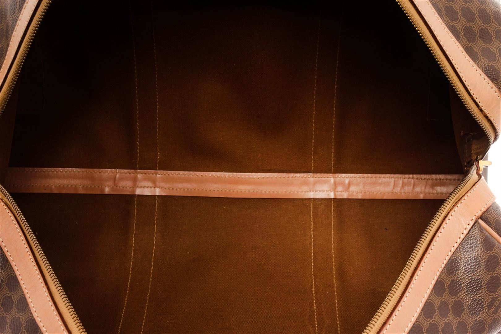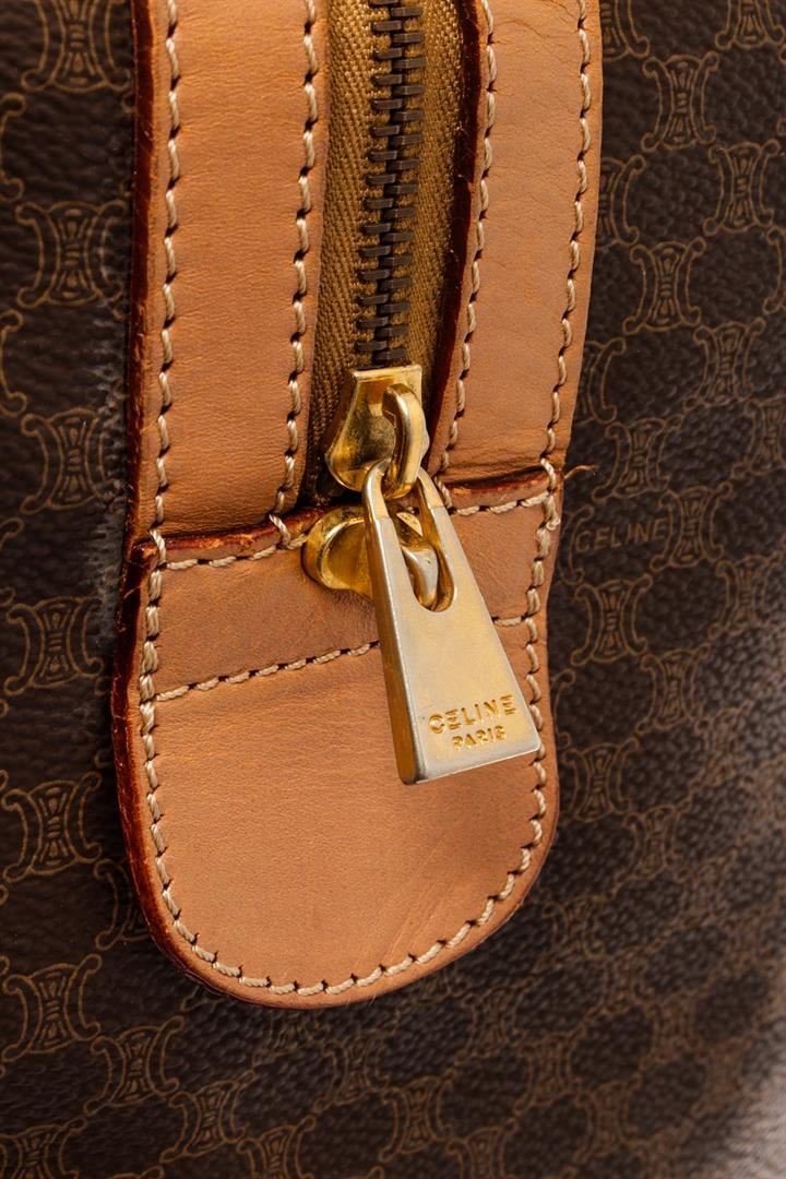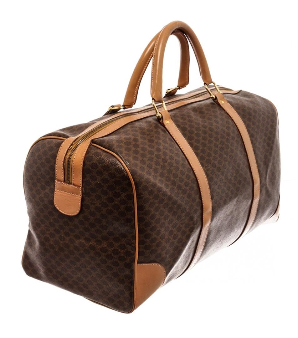 Celine Brown Leather Macadam Duffle Bag. All available information is listed in the description and shown in the photos. Celine Brown Leather Macadam Duffle Bag with this bag features, tan leather trim, dual rolled top handles, tonal stitching, gold-tone hardware, canvas interior lining, single pocket at interior wall and zip closure at top. Height 7", Width 16.25", Depth 13", Handle Drop 5" / 17.78 x 41.27 x 33.02 Cm