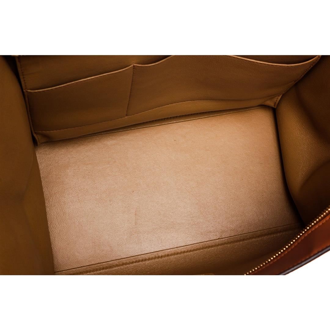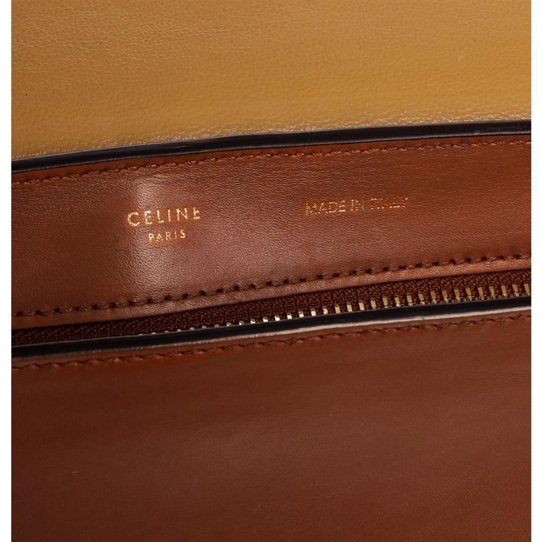 Brown leather Celine Medium Trapeze bag with silver-tone hardware, detachable flat shoulder strap, single rolled top handle, exterior zip pocket at back, snap expansions at sides, tonal suede trim, tonal leather lining, dual interior slit pockets and zip closure at top with additional flip-lock closures at front flap. Authentic.