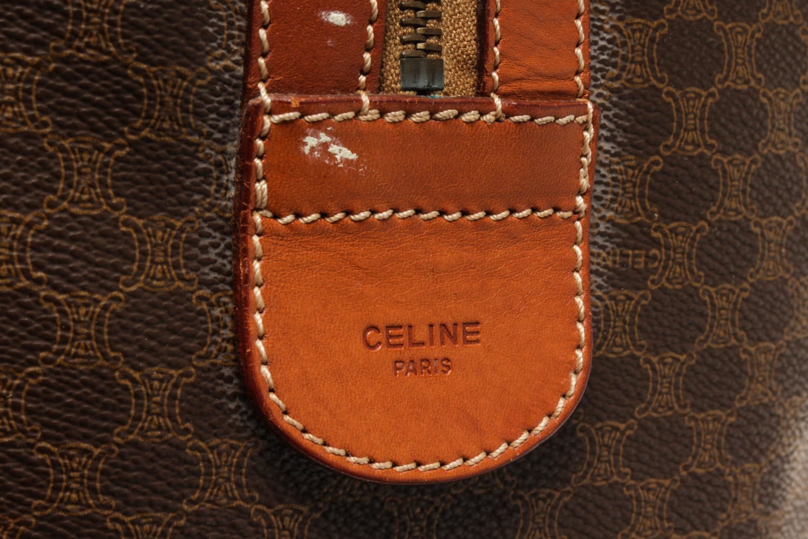 One Celine Brown Macadam Boston Bag. Item is sold AS-IS. All available information is listed in the description and shown in the photo. Celine Brown Macadam Boston Bag with top handle, gold tone hardware, zipper closure and canvas lining. There is wear on the bottom and white marks around the bag. Please refer to photos.