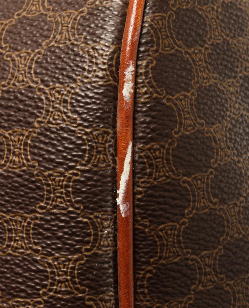 One Celine Brown Macadam Boston Bag. Item is sold AS-IS. All available information is listed in the description and shown in the photo. Celine Brown Macadam Boston Bag with top handle, gold tone hardware, zipper closure and canvas lining. There is wear on the bottom and white marks around the bag. Please refer to photos.