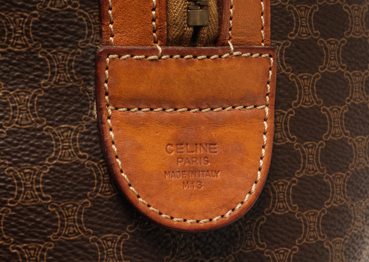 One Celine Brown Macadam Boston Bag. Item is sold AS-IS. All available information is listed in the description and shown in the photo. Celine Brown Macadam Boston Bag with top handle, vachetta leather, leather lining, gold tone hardware, zipper closure. 14" x 9" x 7" / 35.56 X 22.86 X 7CM