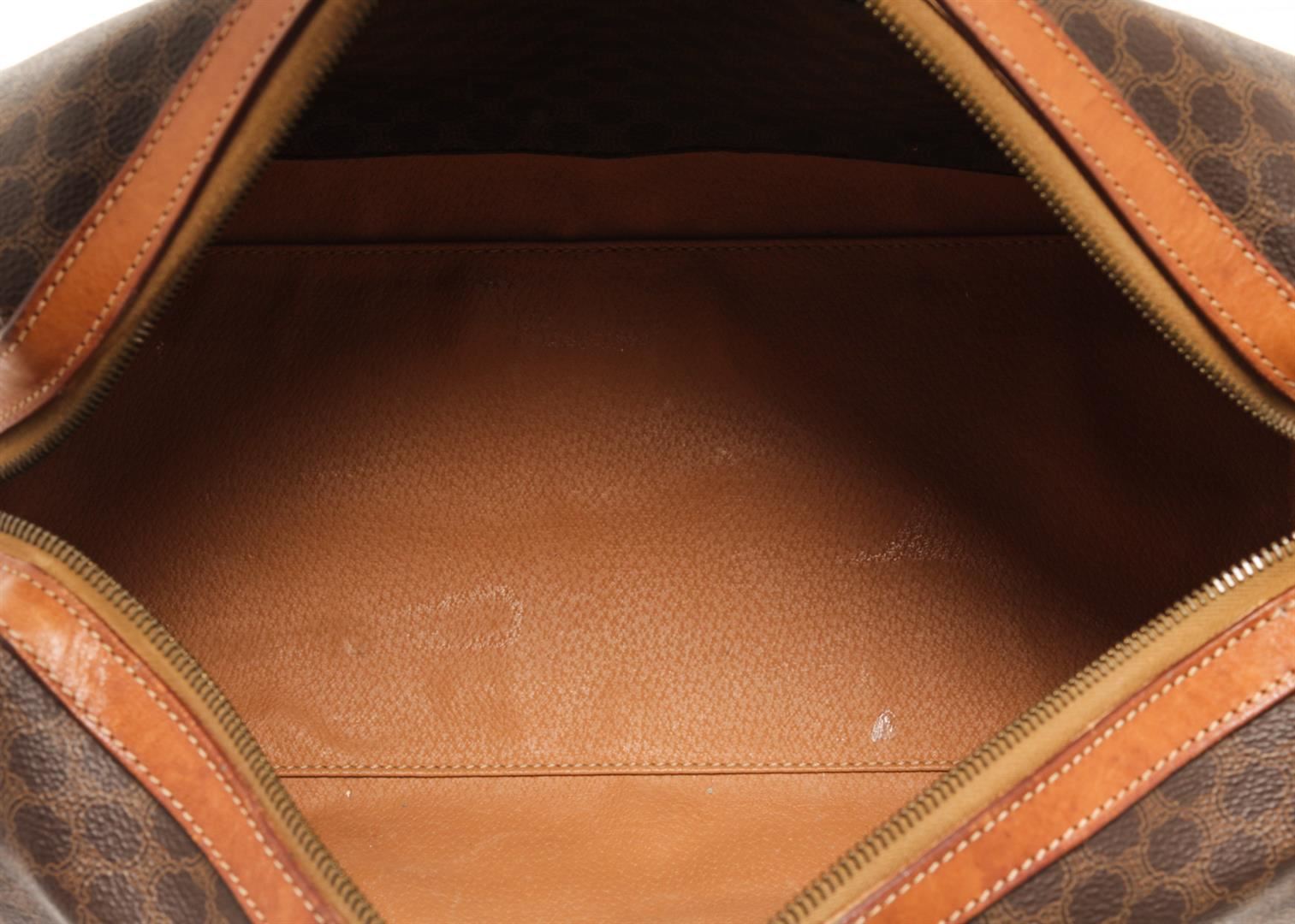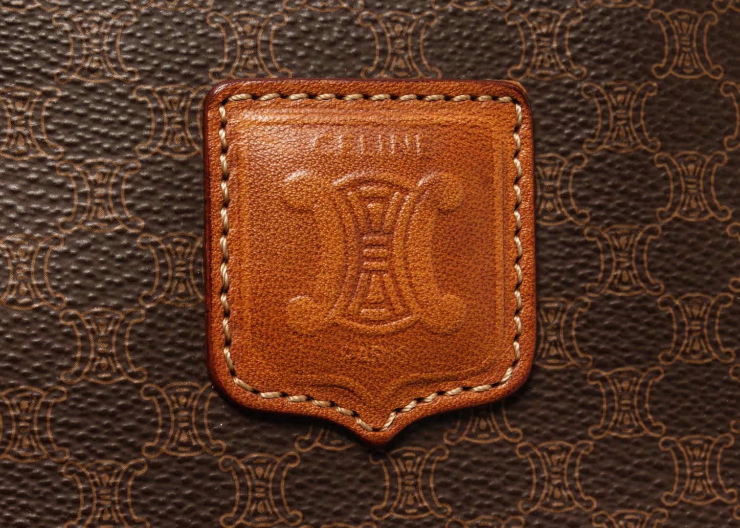 One Celine Brown Macadam Boston Bag. Item is sold AS-IS. All available information is listed in the description and shown in the photo. Celine Brown Macadam Boston Bag with top handle, vachetta leather, leather lining, gold tone hardware, zipper closure. 14" x 9" x 7" / 35.56 X 22.86 X 7CM