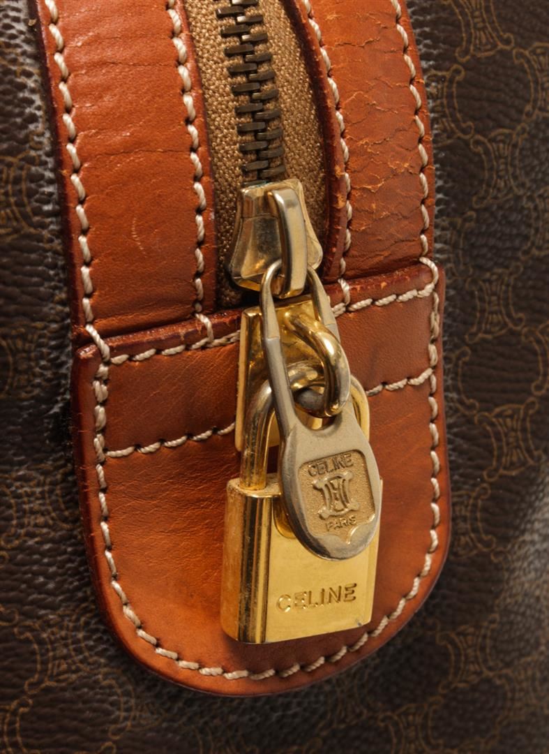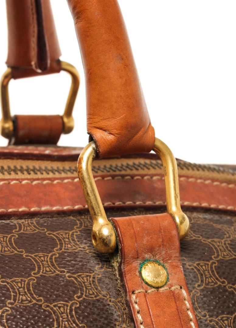 One Celine Brown Macadam Boston Bag. Item is sold AS-IS. All available information is listed in the description and shown in the photo. Celine Brown Macadam Boston Bag with top handle, gold tone hardware, zipper closure and canvas lining. There is wear on the bottom and white marks around the bag. Please refer to photos.