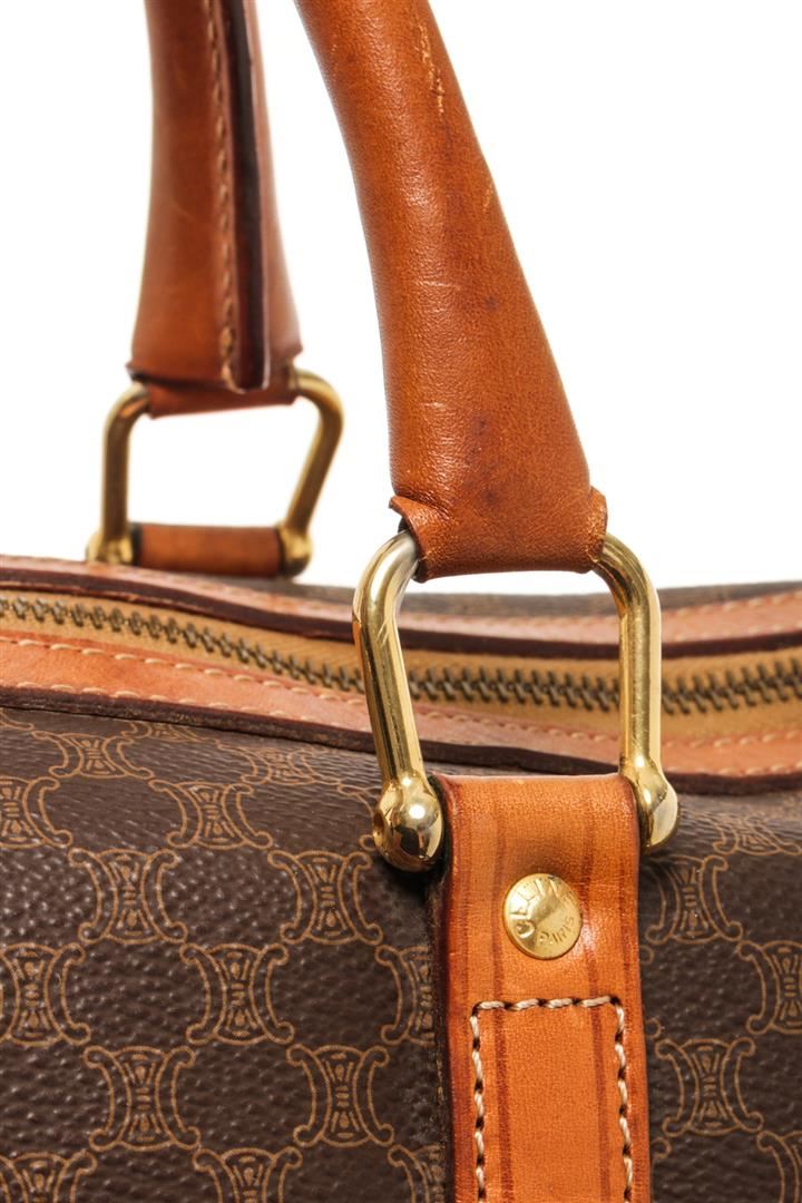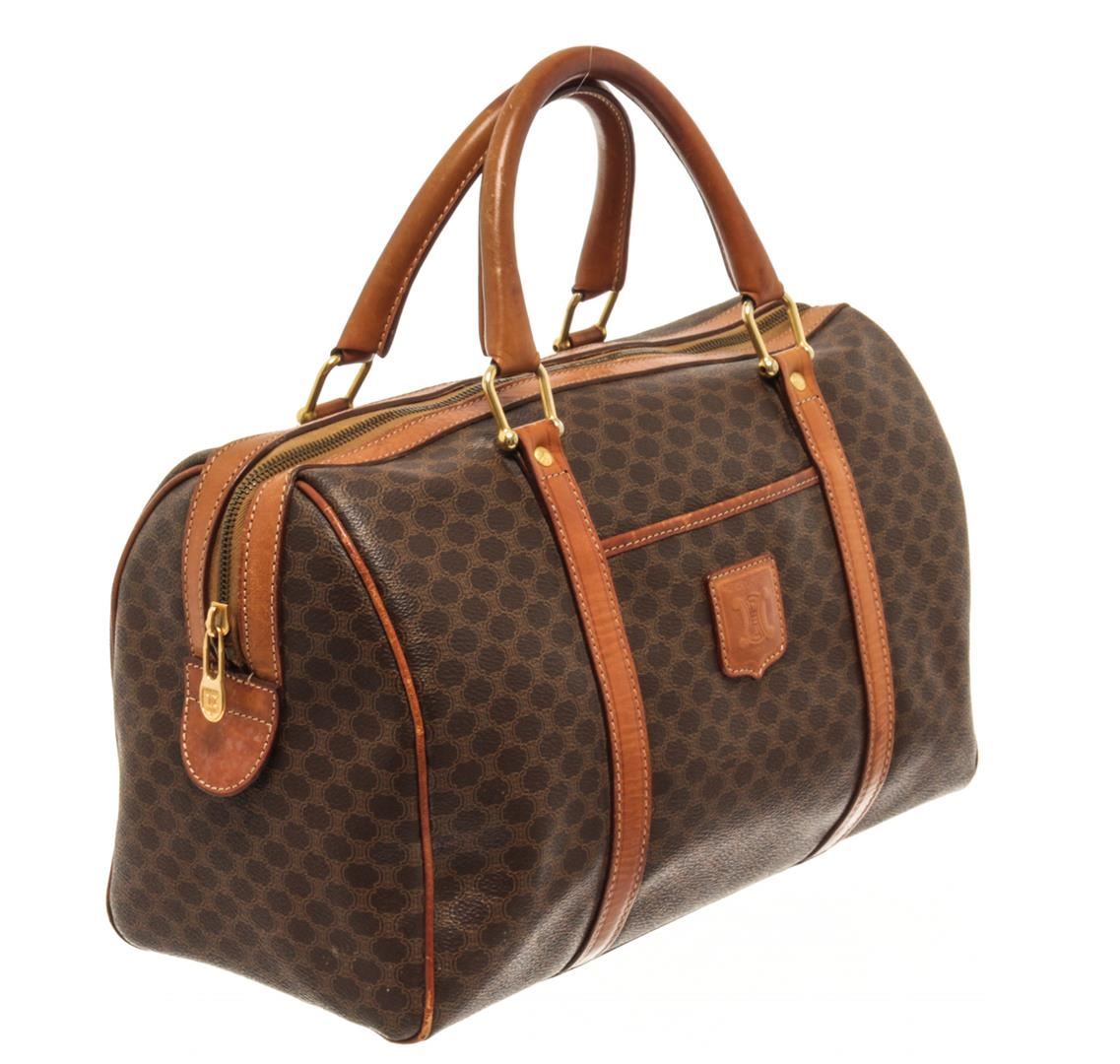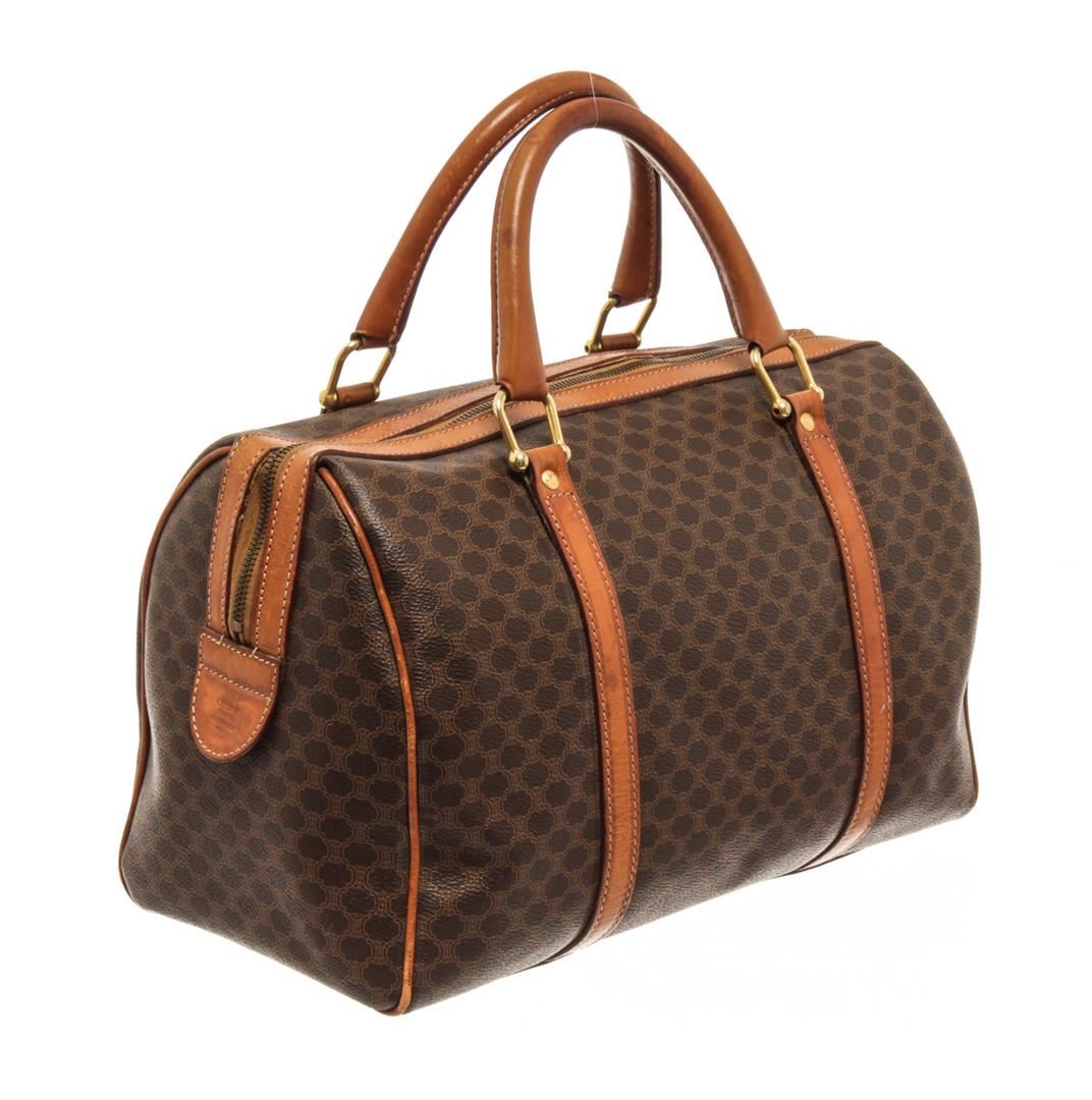 One Celine Brown Macadam Boston Bag. Item is sold AS-IS. All available information is listed in the description and shown in the photo. Celine Brown Macadam Boston Bag with top handle, vachetta leather, leather lining, gold tone hardware, zipper closure. 14" x 9" x 7" / 35.56 X 22.86 X 7CM