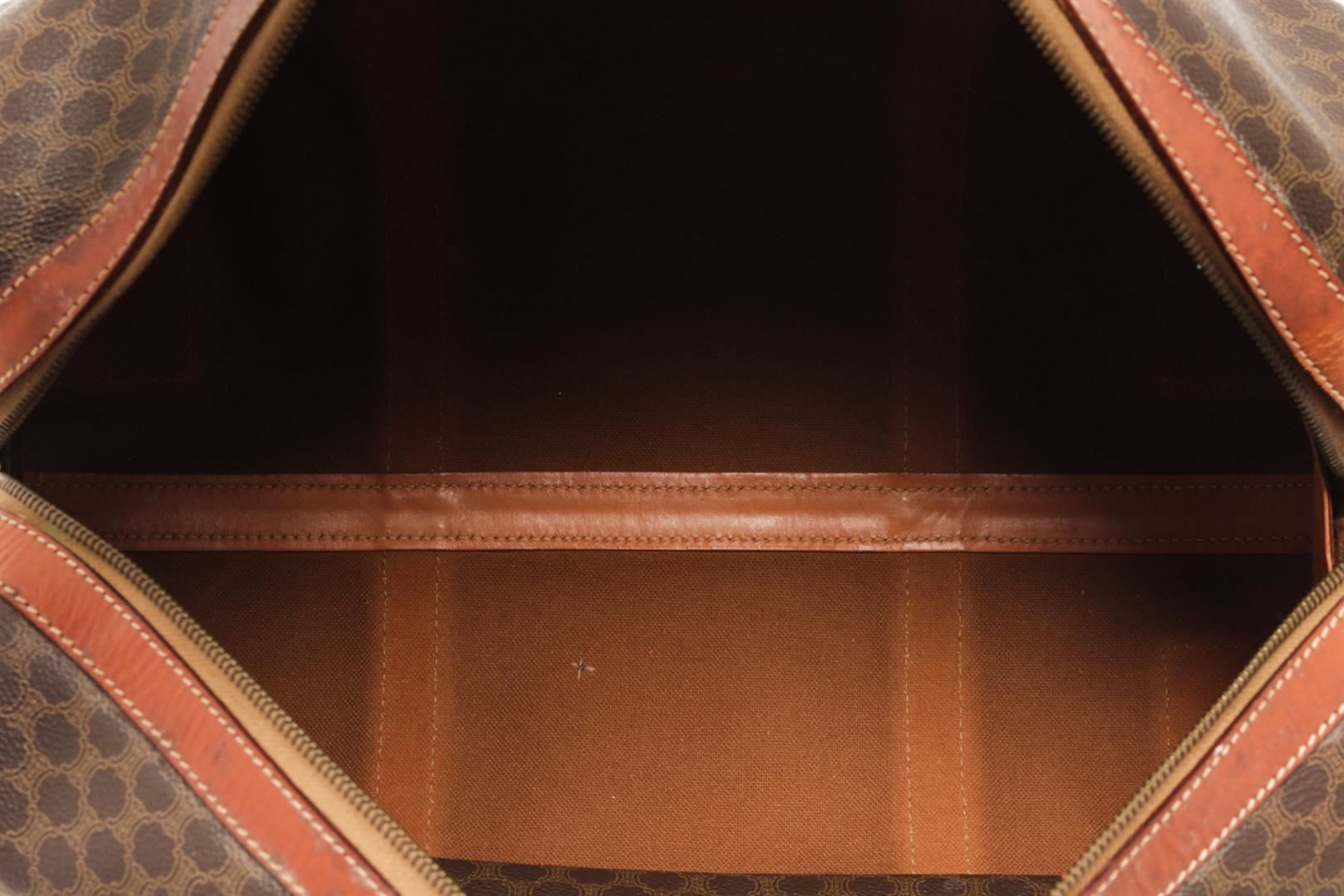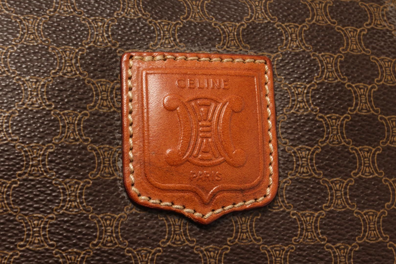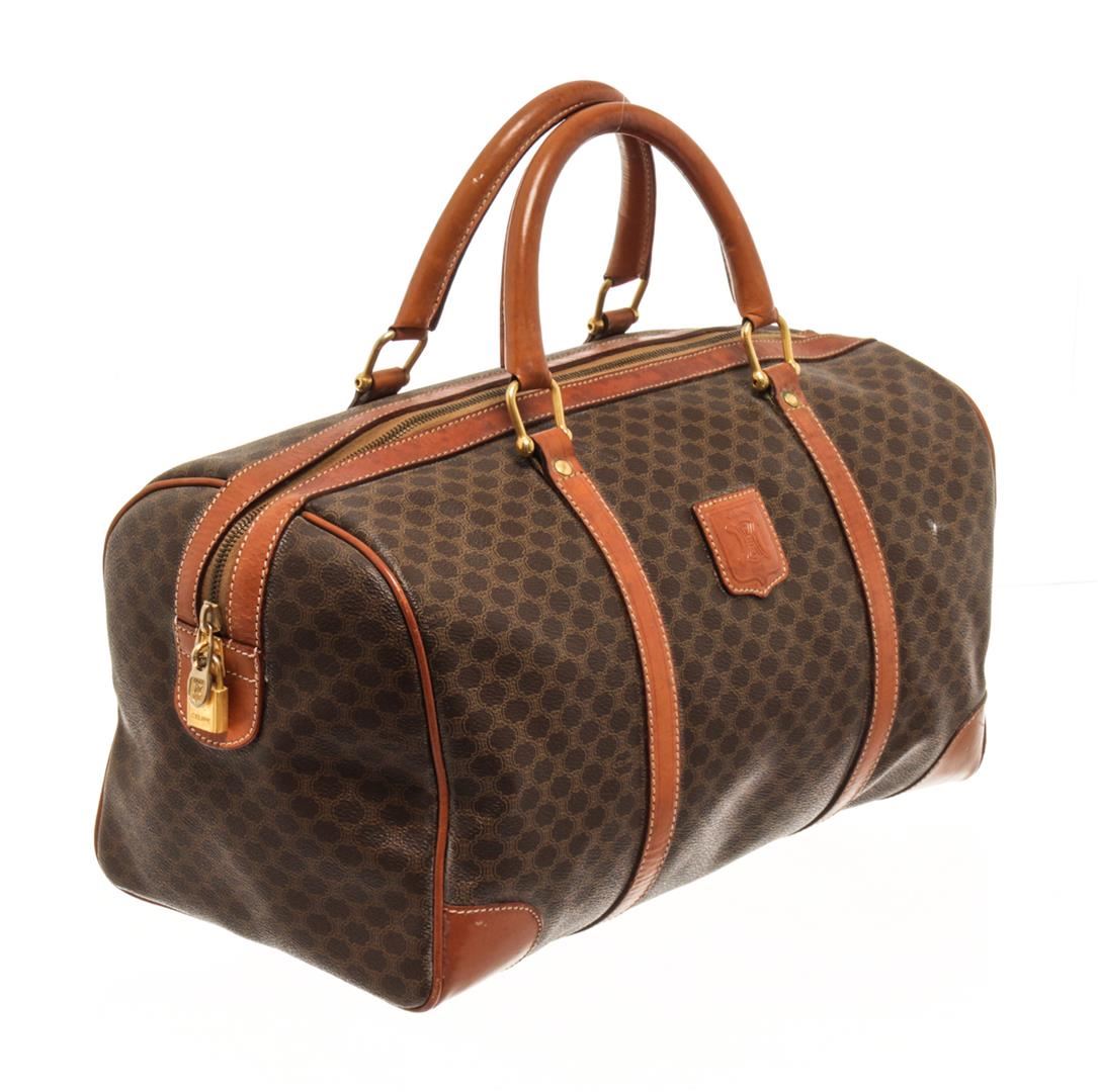 One Celine Brown Macadam Boston Bag. Item is sold AS-IS. All available information is listed in the description and shown in the photo. Celine Brown Macadam Boston Bag with top handle, gold tone hardware, zipper closure and canvas lining. There is wear on the bottom and white marks around the bag. Please refer to photos.