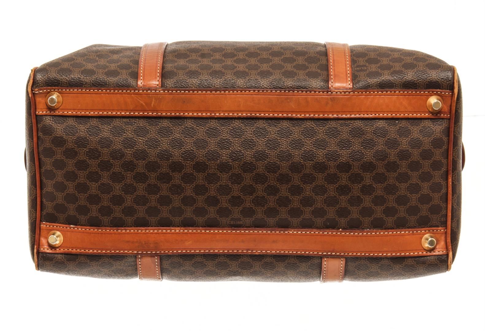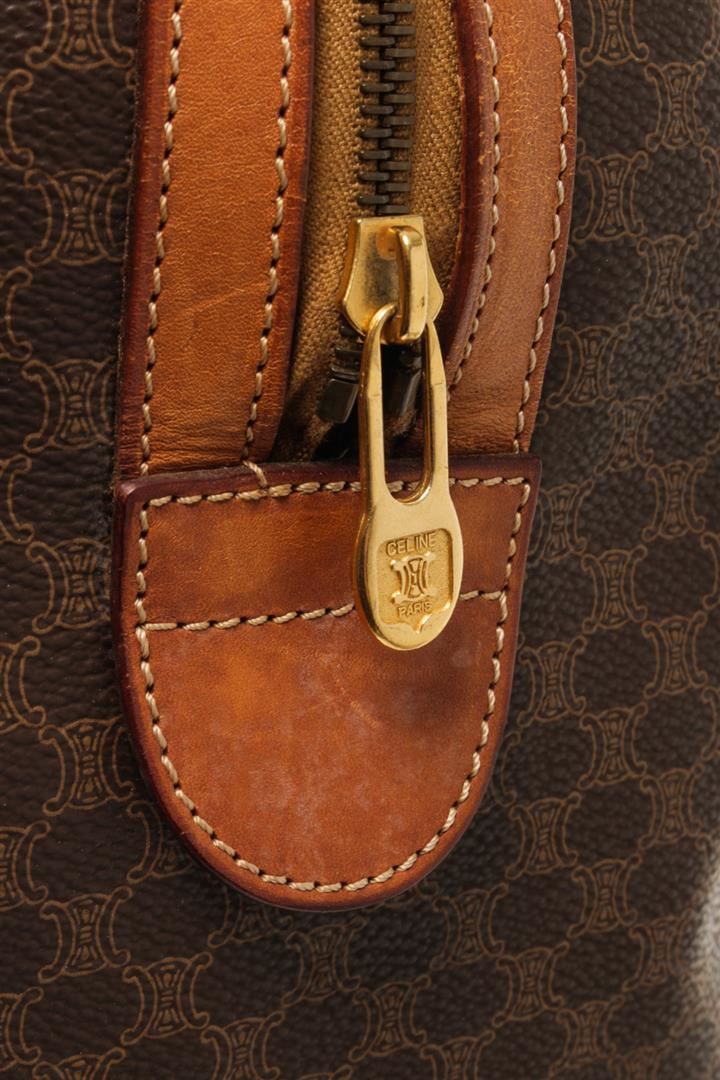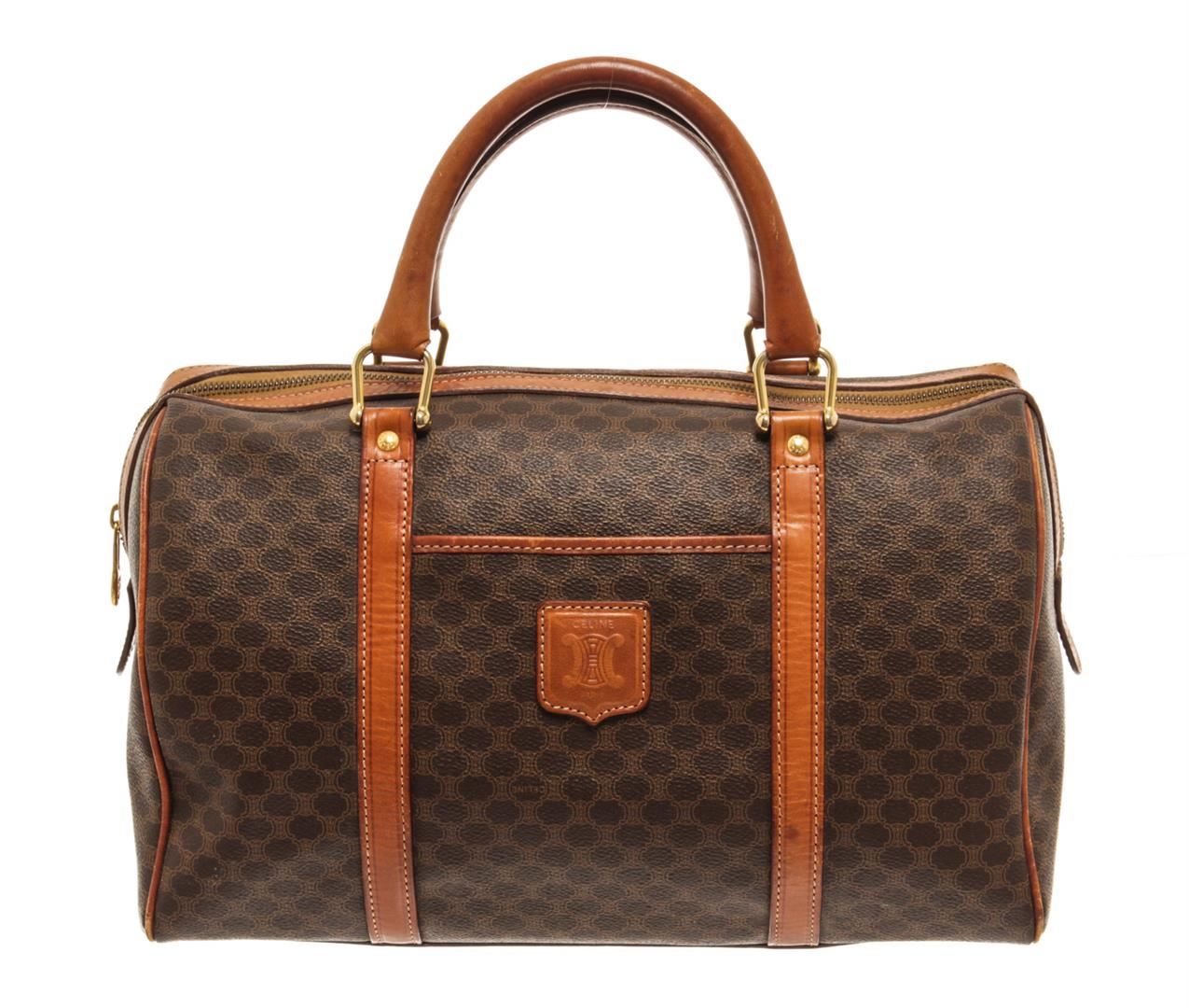 One Celine Brown Macadam Boston Bag. Item is sold AS-IS. All available information is listed in the description and shown in the photo. Celine Brown Macadam Boston Bag with top handle, vachetta leather, leather lining, gold tone hardware, zipper closure. 14" x 9" x 7" / 35.56 X 22.86 X 7CM