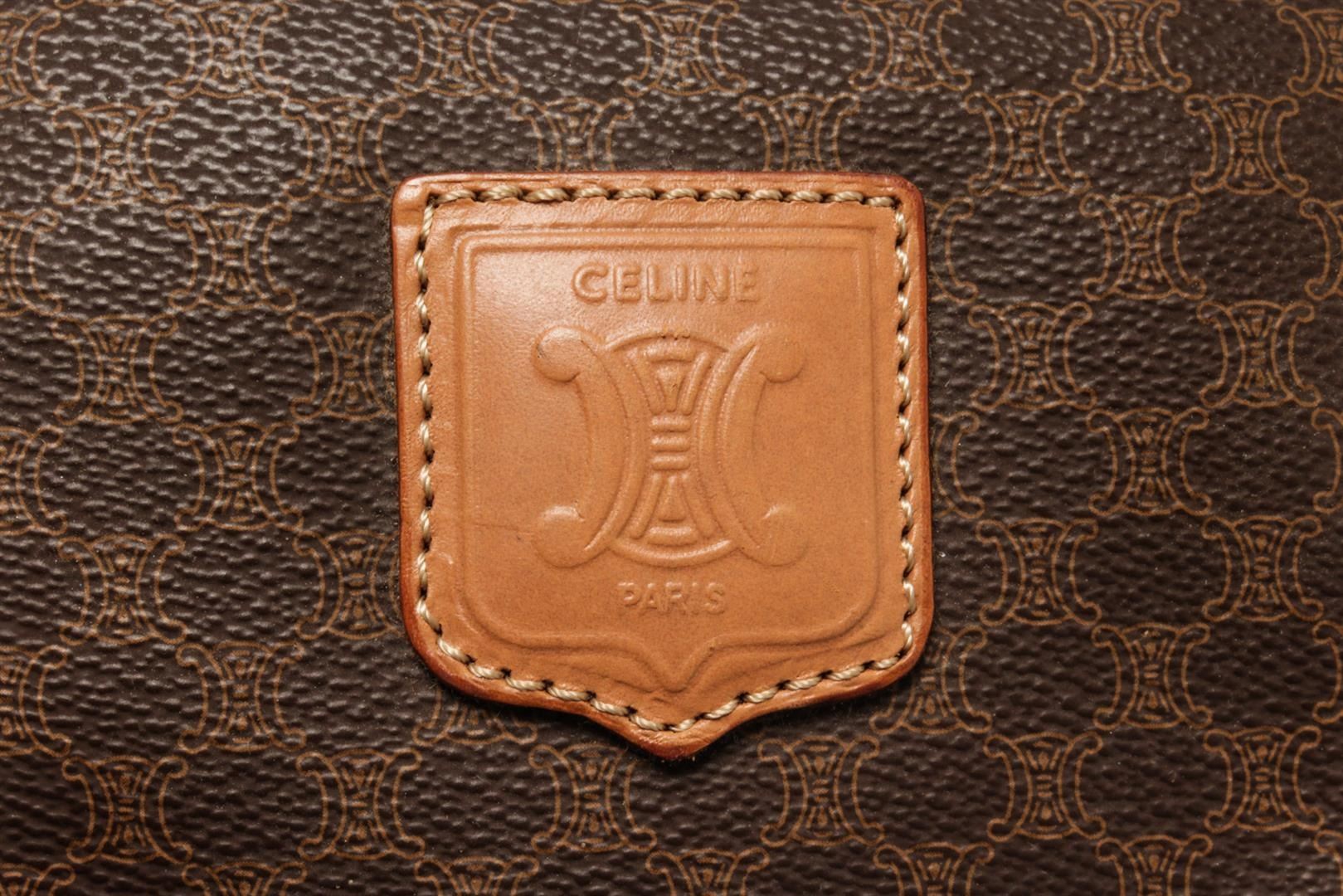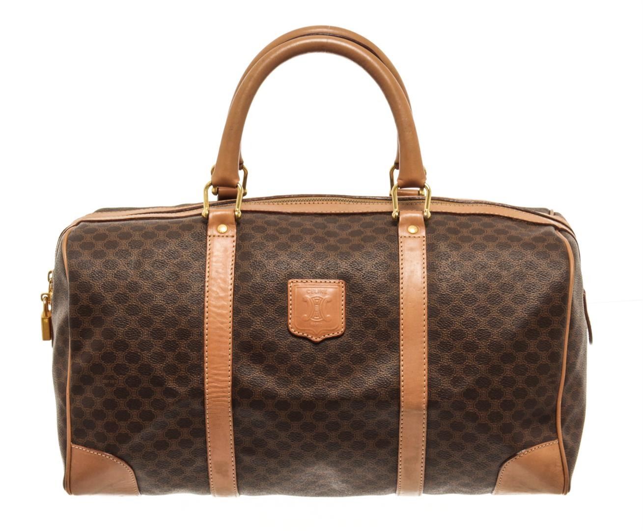 One Celine Brown Macadam Canvas Boston Bag. Item is sold AS-IS. All available information is listed in the description and shown in the photo. Celine Brown Macadam Canvas Boston Bag with top handle, canvas lining, markings on bottom of the bag, zipper closure and gold tone hardware. Please refer to photos for markings