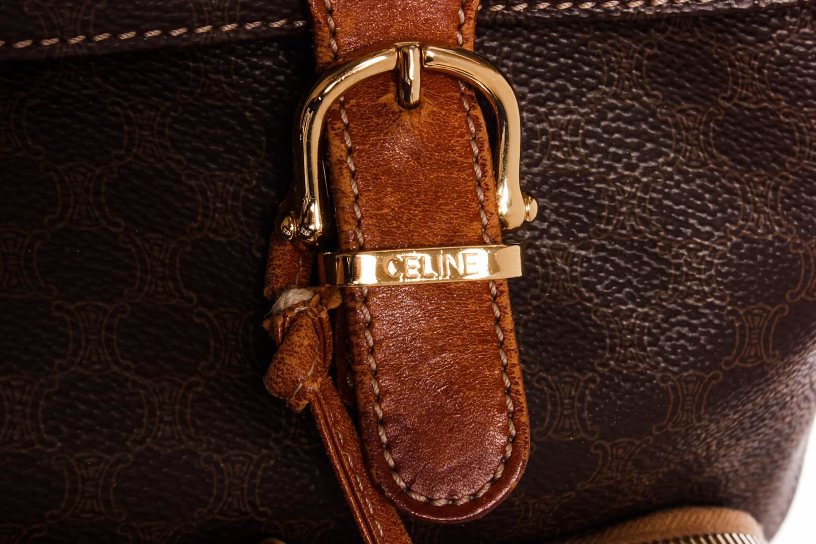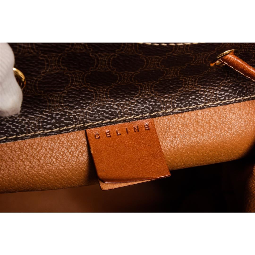 Brown and tan monogram coated canvas Céline Macadam backpack with gold-tone hardware, tan leather trim, dual flat handles, and brown leather lining. Authentic.