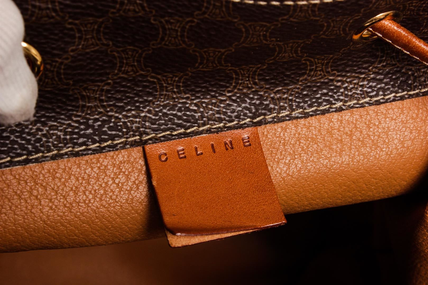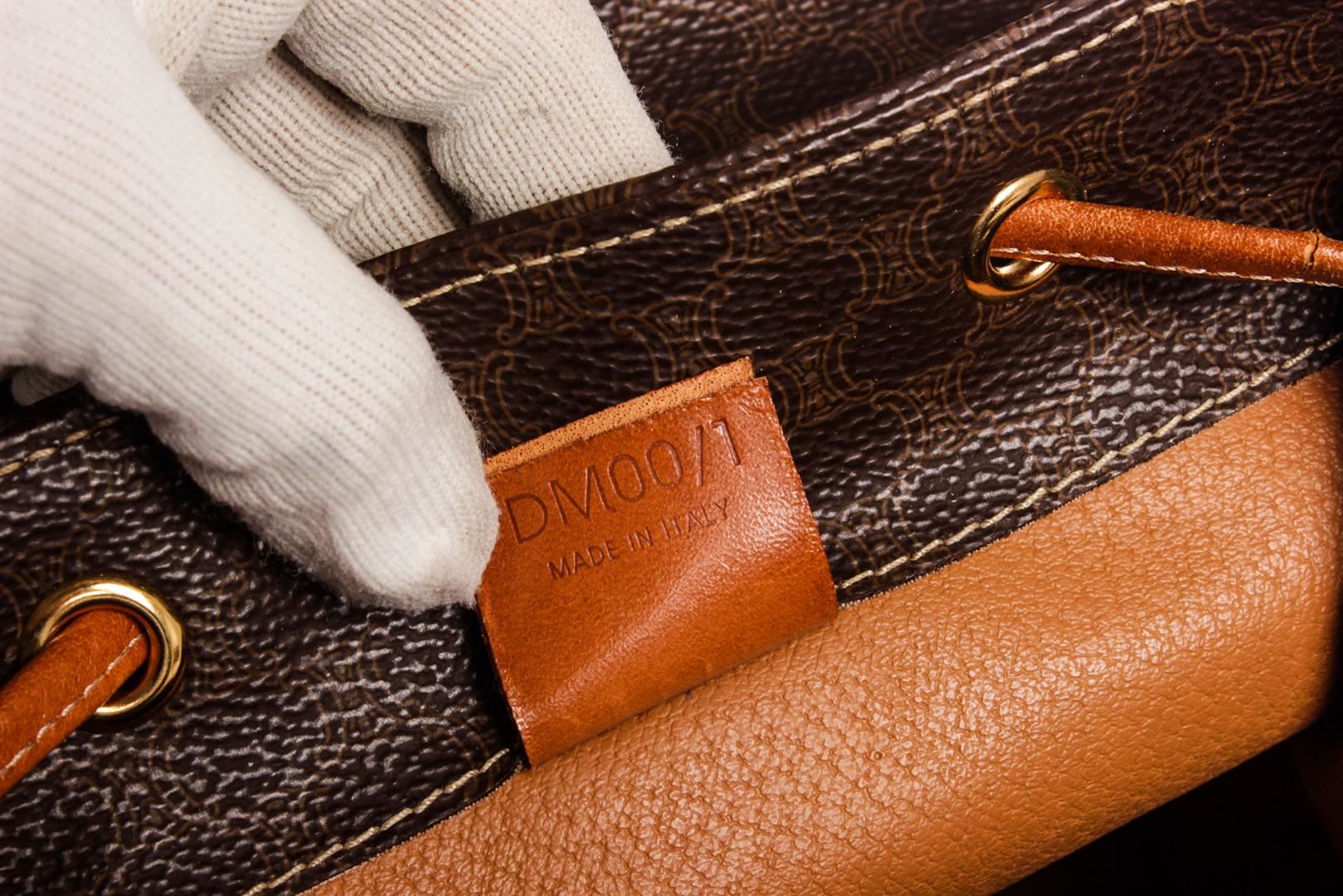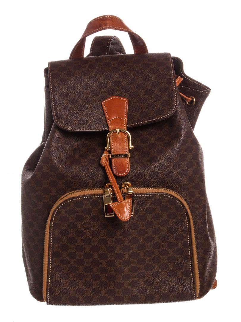 One Celine Brown Macadam Canvas Leather Trim Medium Backpack. Brown and tan monogram coated canvas Céline Macadam backpack with gold-tone hardware, tan leather trim, dual flat handles, and brown leather lining. MKX