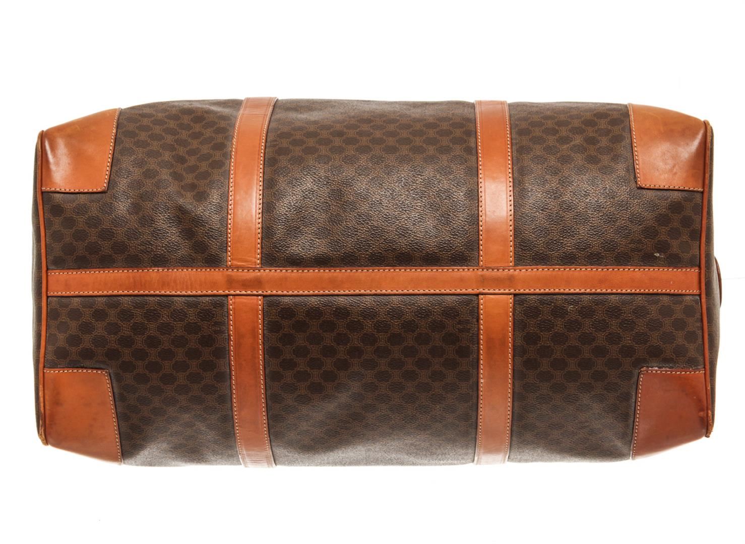 One Celine Brown Macadam Pattern Logo Embossed Big Boston Bag. Item is sold AS-IS. All available information is listed in the description and shown in the photo. Celine Brown Macadam Pattern Logo Embossed Big Boston Bag with top handle, keys, clochette and lock, zipper closure, canvas lining. H 28cm x W 48cm x D 20cm Handle 35cm. / 11.02 x 18.89 x 7.87 Inches