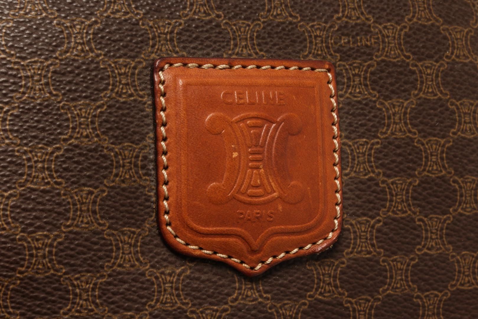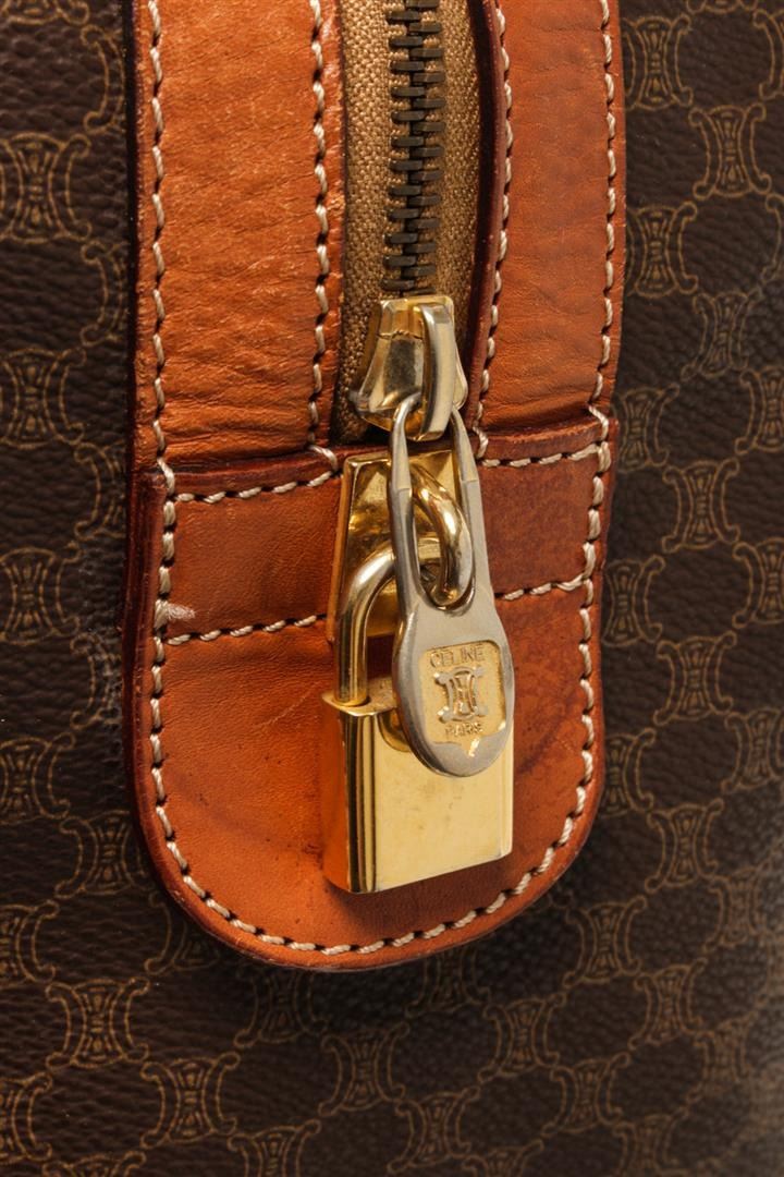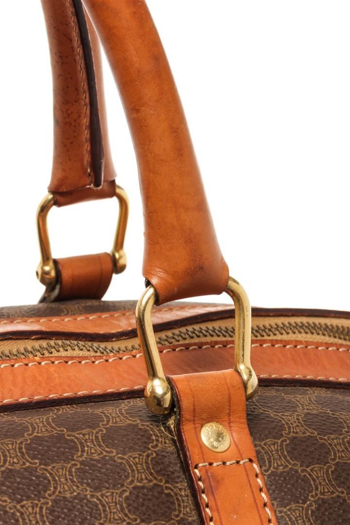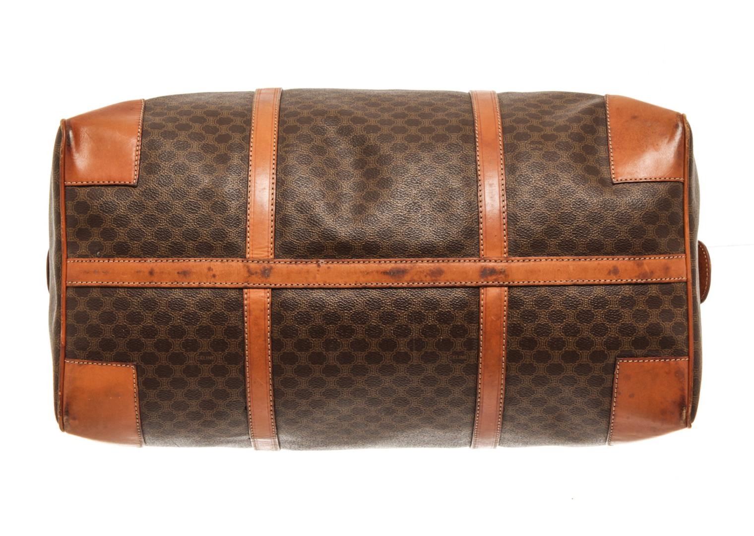 One Celine Brown Macadam Pattern Logo Embossed Big Boston Bag. Item is sold AS-IS. All available information is listed in the description and shown in the photo. Celine Brown Macadam Pattern Logo Embossed Big Boston Bag with top handle, keys, clochette and lock, zipper closure, canvas lining. There is some wear on the bottom of the bag. Please refer to photos. H 28cm x W 48cm x D 20cm Handle 35cm. / 11.02 x 18.89 x 7.87 Inches